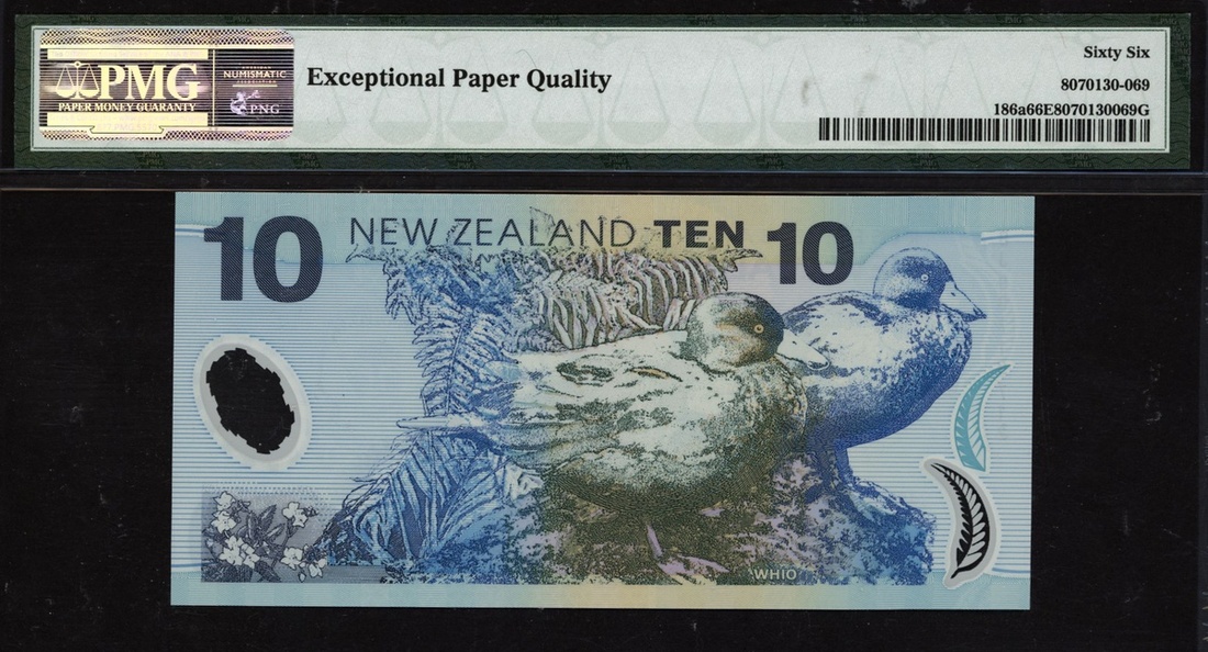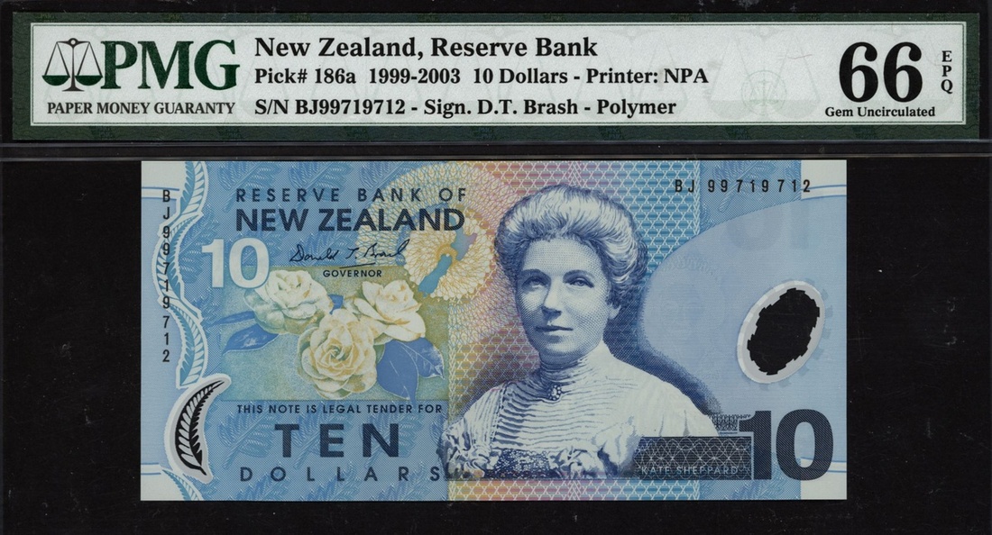 (x) Reserve Bank of New Zealand, 10 dollars, 1999-2003, serial number BJ99719712, (Pick 186a), in PMG holder 66 EPQ Gem Uncirculated