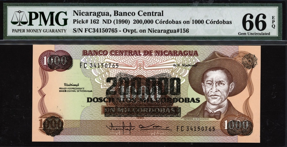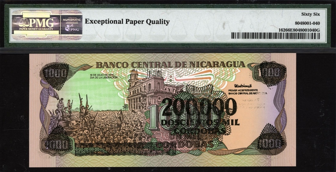 (x) Banco Central de Nicaragua, 200,000 cordobas on 1000 cordobas, ND (1990), serial number FC34150765, (Pick 162), in PMG holder 66 EPQ Gem Uncirculated