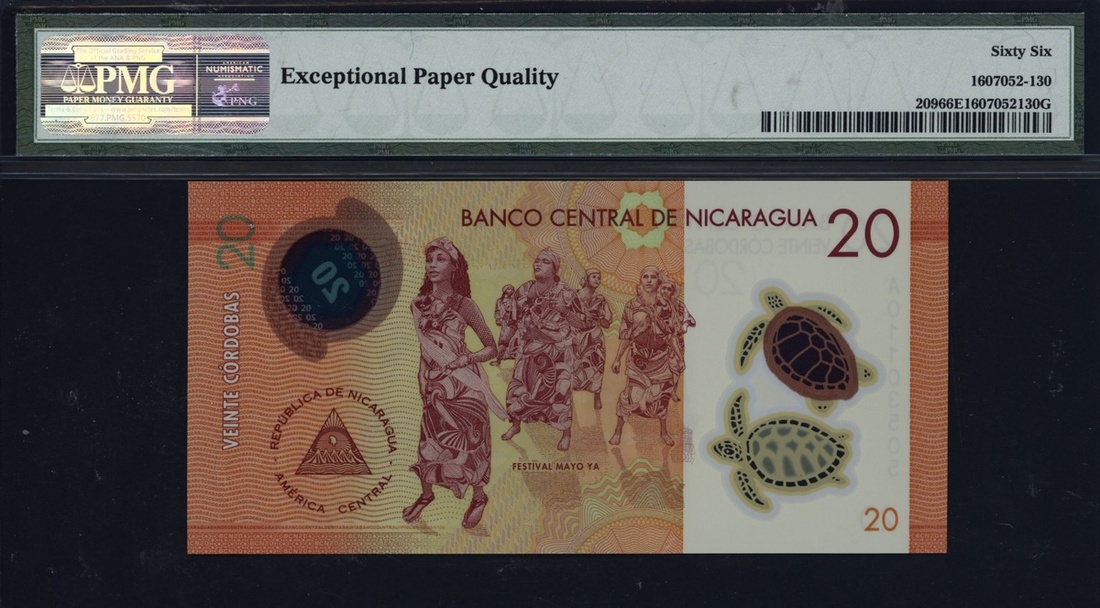 (x) Banco Central de Nicaragua, 20 codobas, 2014 (ND 2015), serial number A01103505 (Pick 209), in PMG holder 66 EPQ Gem Uncirculated