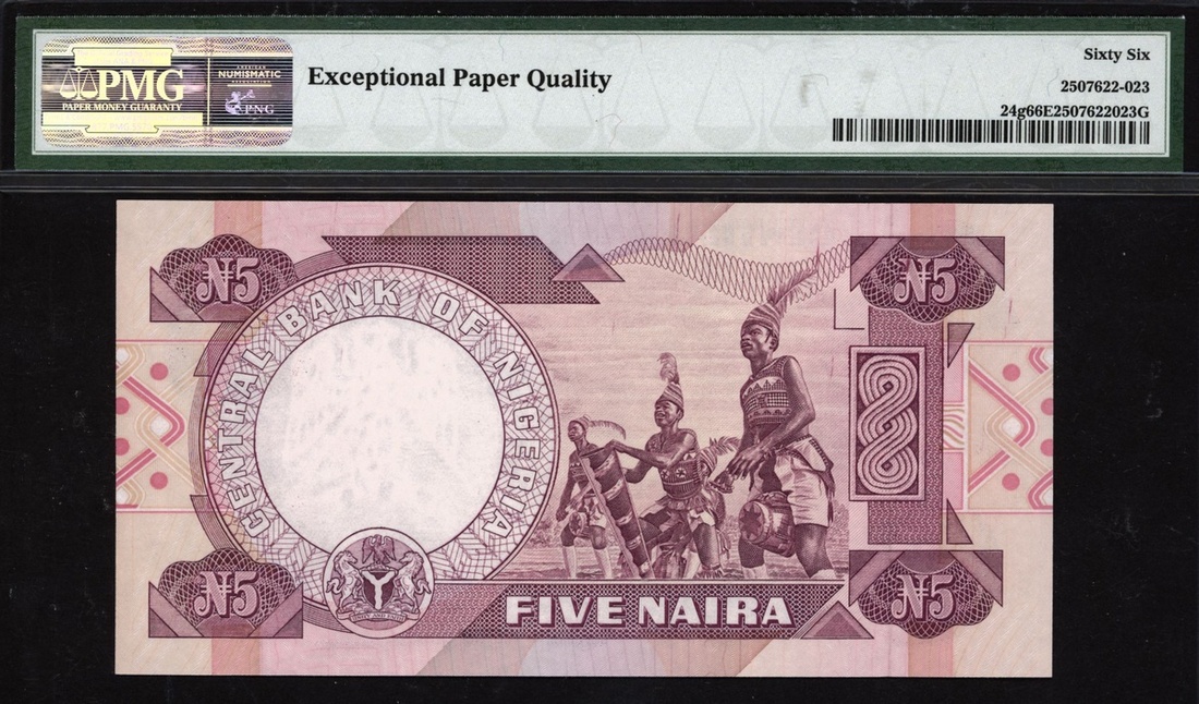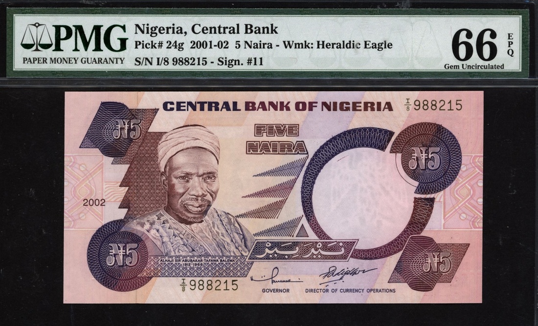 (x) Central Bank of Nigeria, 5 naira, 2001-02, serial number I/8 988215, (Pick 24g), in PMG holder 66 EPQ Gem Uncirculated