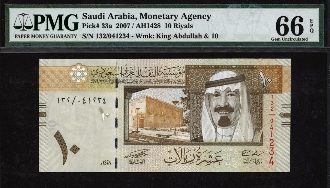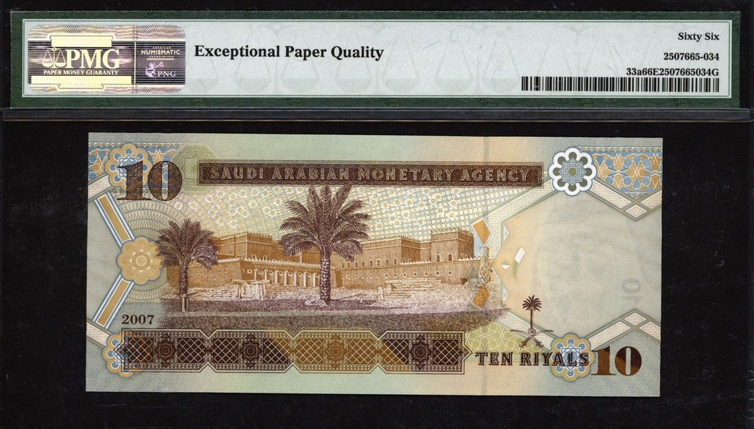 (x) Monetary Agency, Saudi Arabia, 10 riyals, 2007, serial number 132/041234, (Pick 33a), in PMG holder 66 EPQ Gem Uncirculated