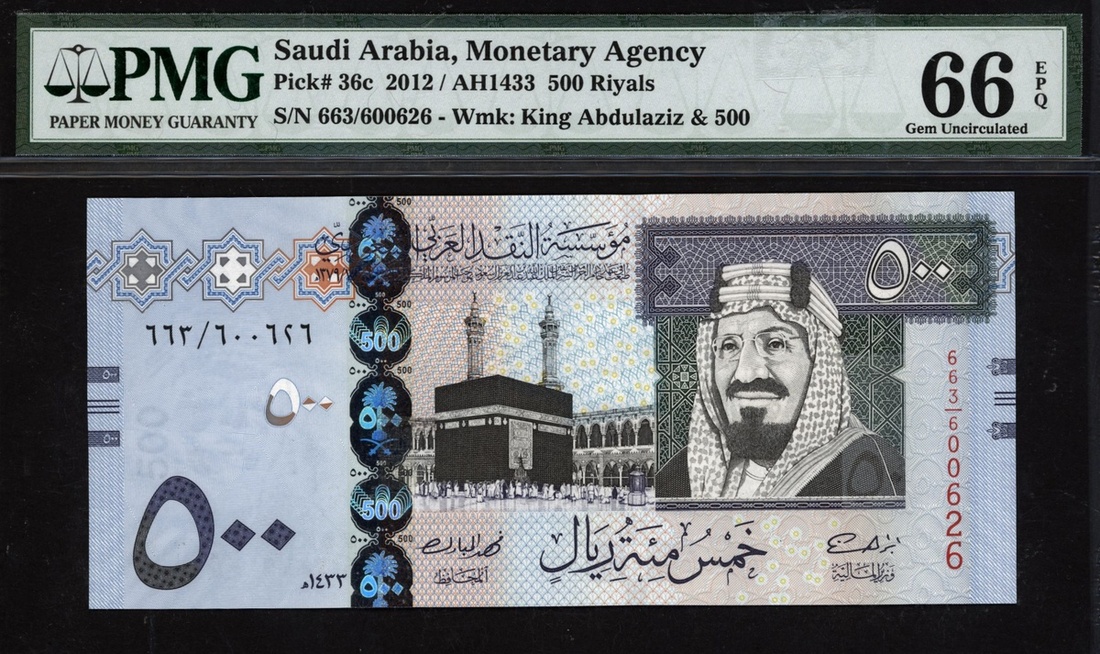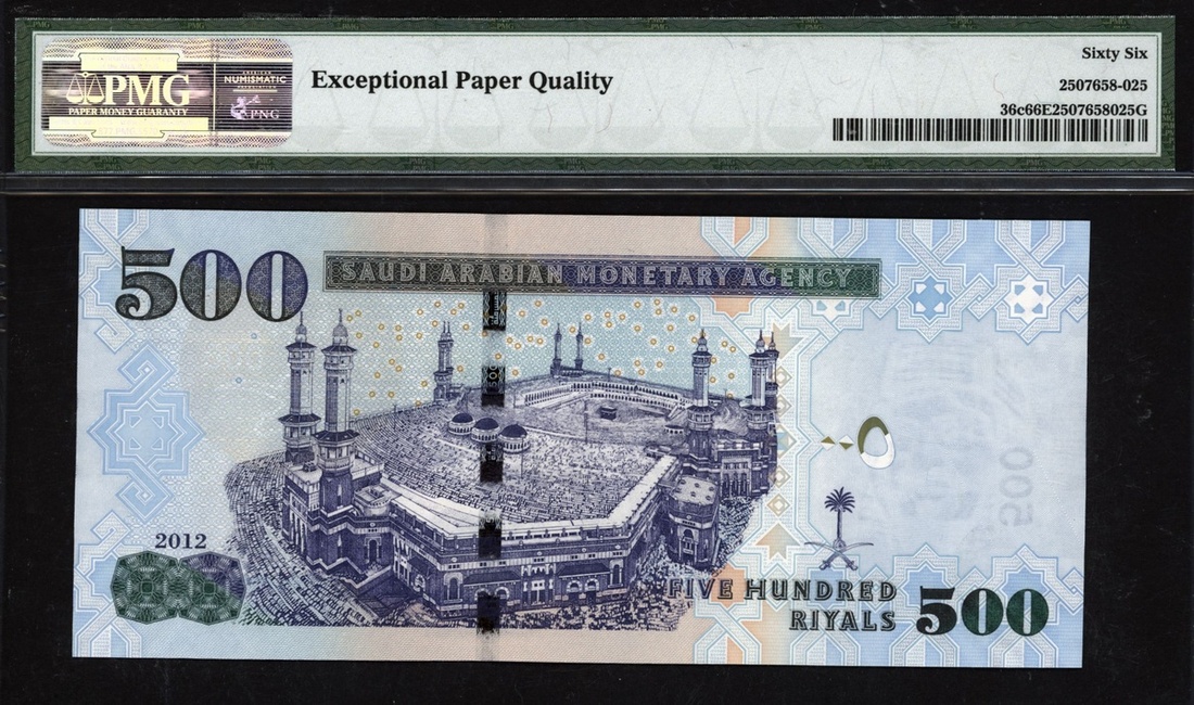 (x) Monetary Agency, Saudi Arabia, 500 riyals, 2012, serial number 663/600626, (Pick 36c), in PMG holder 66 EPQ Gem Uncirculated