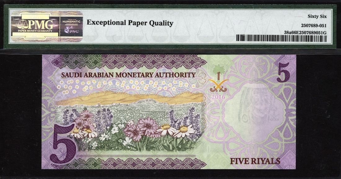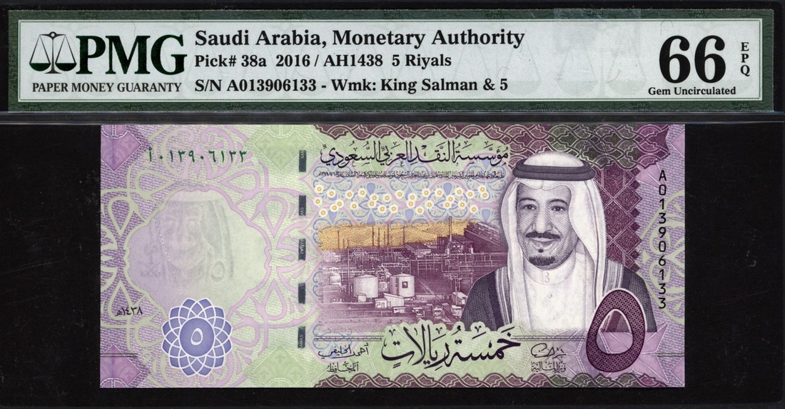 (x) Monetary Authority, Saudi Arabia, 5 riyals, 2016, serial number A013906133, (Pick 38a), in PMG holder 66 EPQ Gem Uncirculated