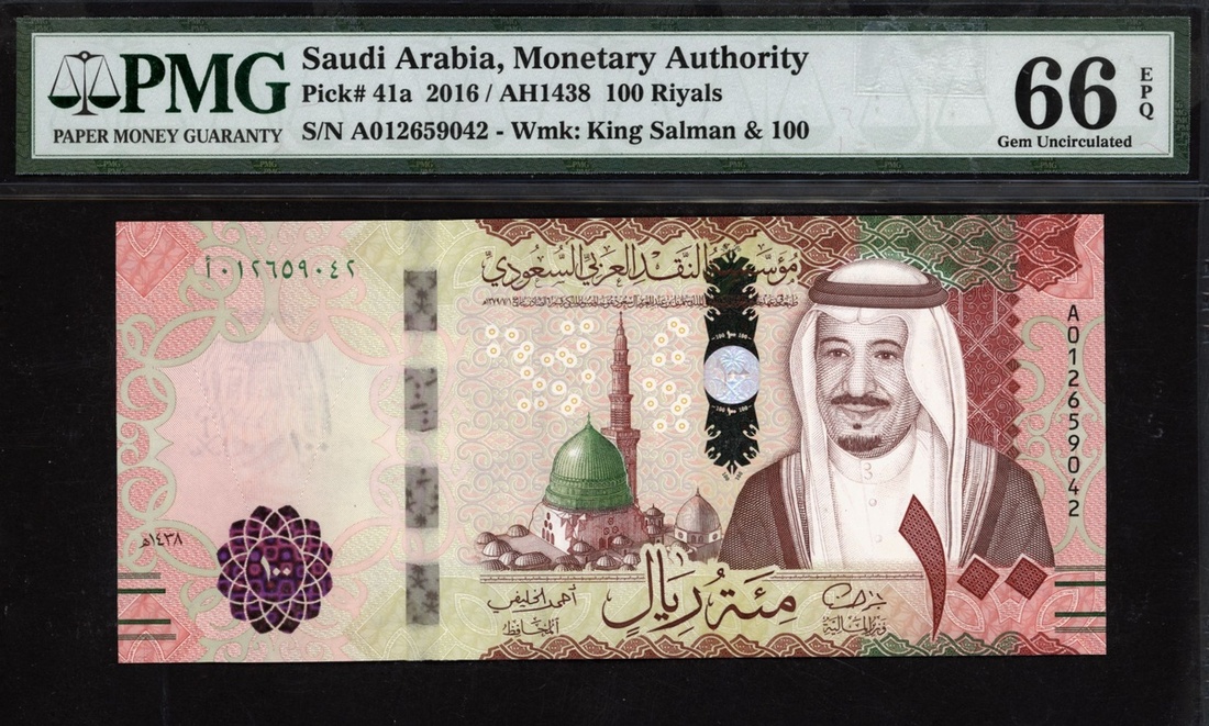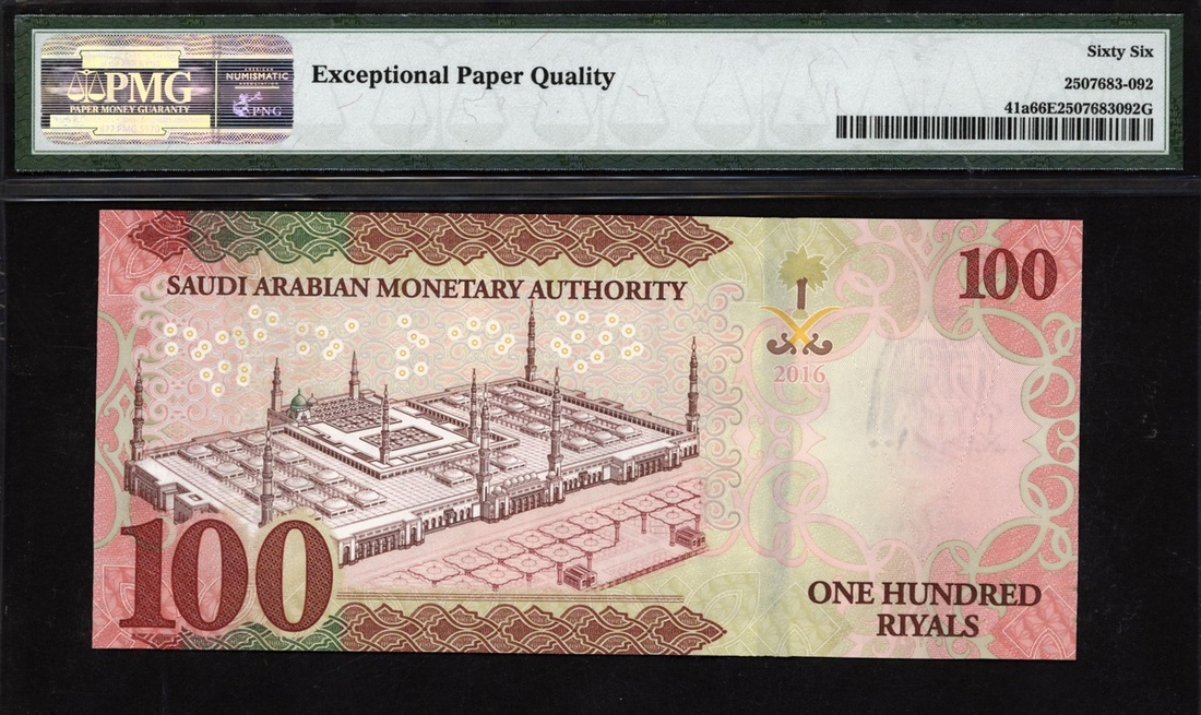(x) Monetary Authority, Saudi Arabia, 100 riyals, 2016, serial number A012659042, (Pick 41a), in PMG holder 66 EPQ Gem Uncirculated