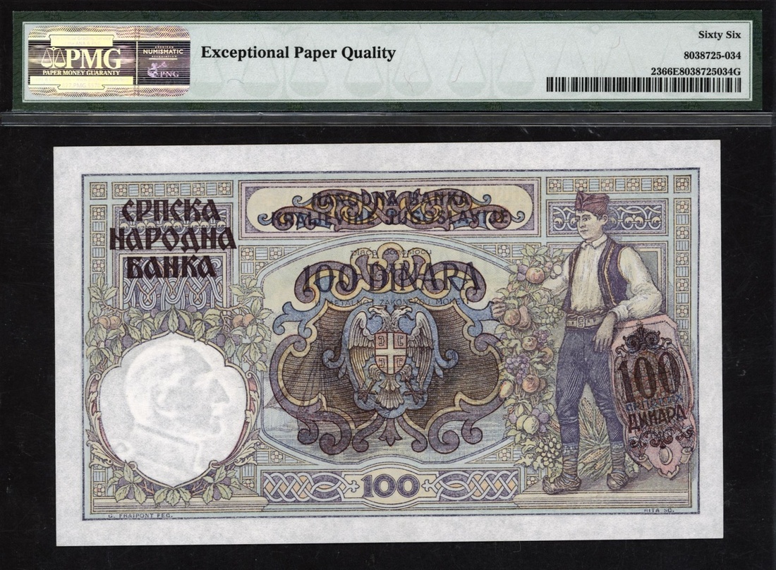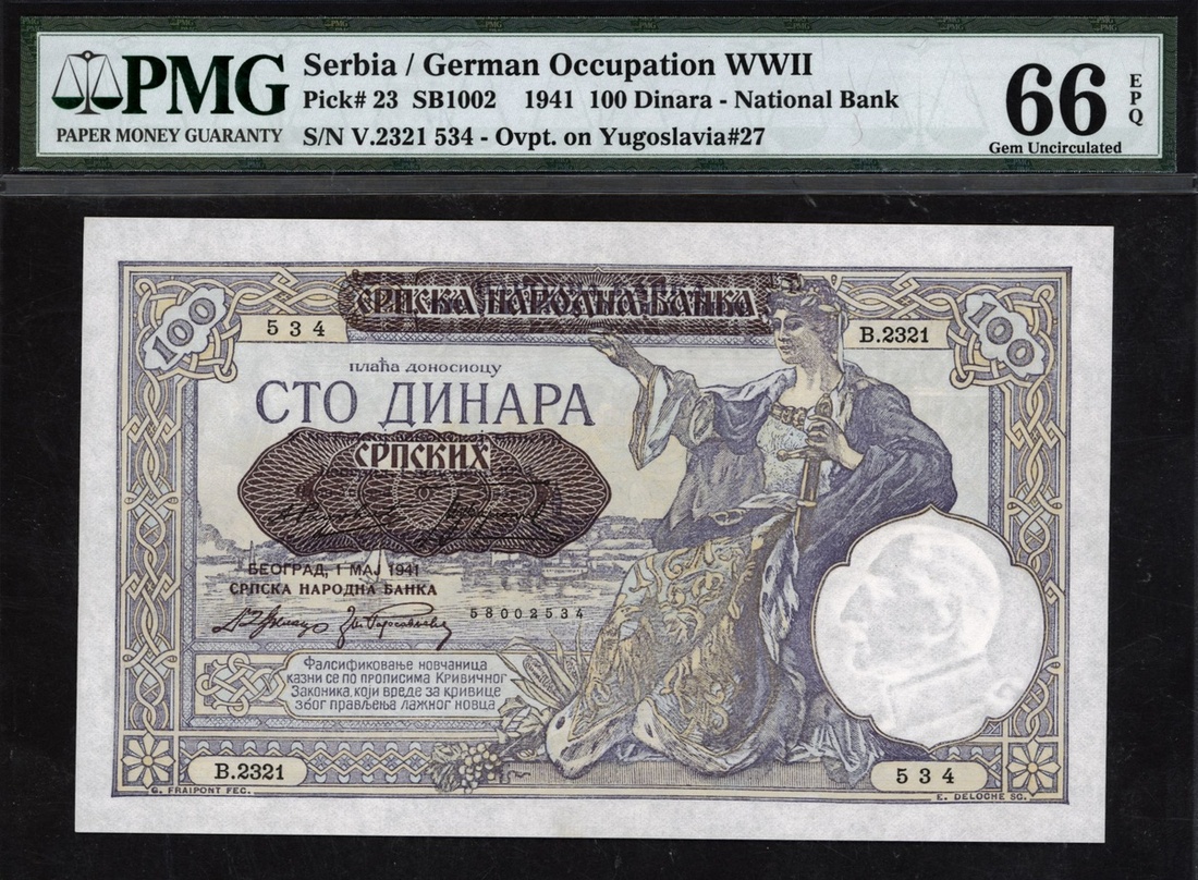(x) Serbia / German Occupation WWII, 100 dinara, 1941, serial number V.2321 534, (Pick 23), in PMG holder 66 EPQ Gem Uncirculated