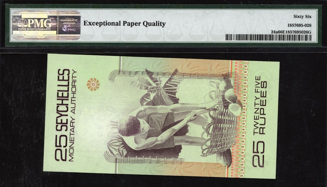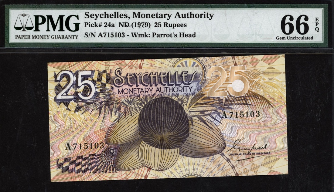 (x) Seychelles Monetary Authority, 25 rupees, ND (1979), serial number A715103, (Pick 24a), in PMG holder 66 EPQ Gem Uncirculated