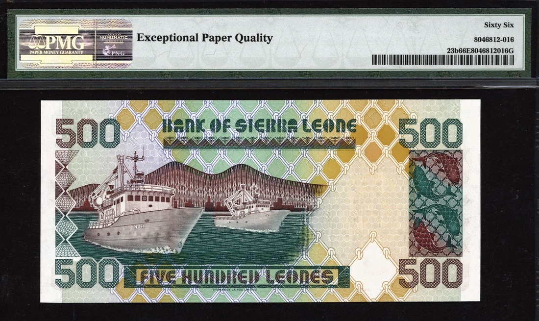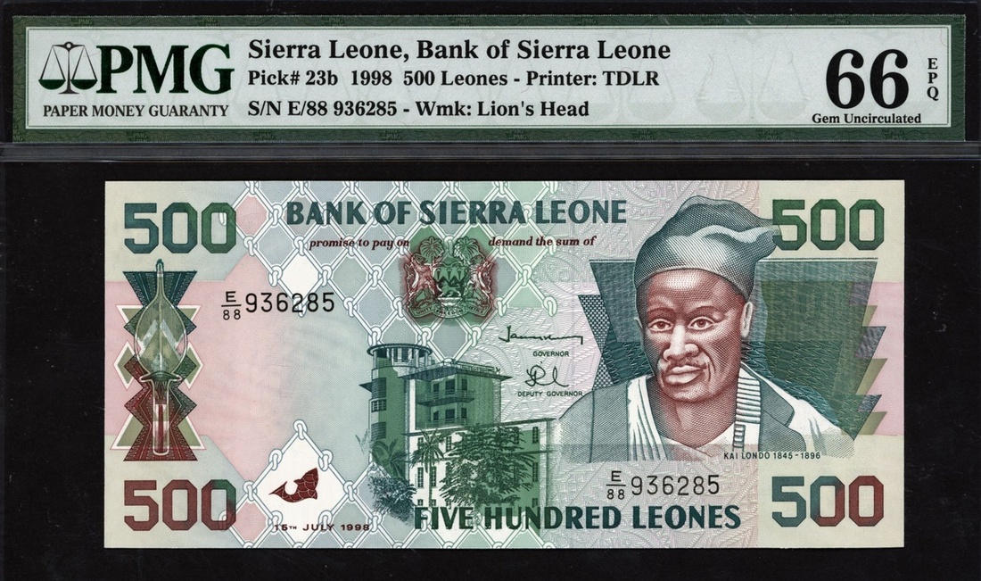(x) Bank of Sierra Leone, 500 leones, 1998, serial number E/88 936285, (Pick 23b), in PMG holder 66 EPQ Gem Uncirculated