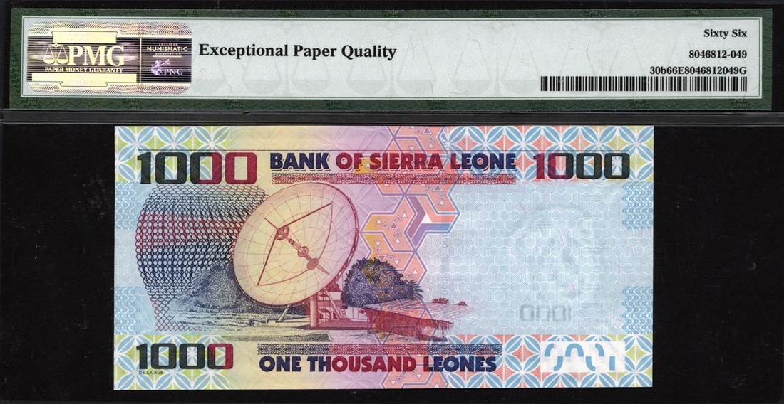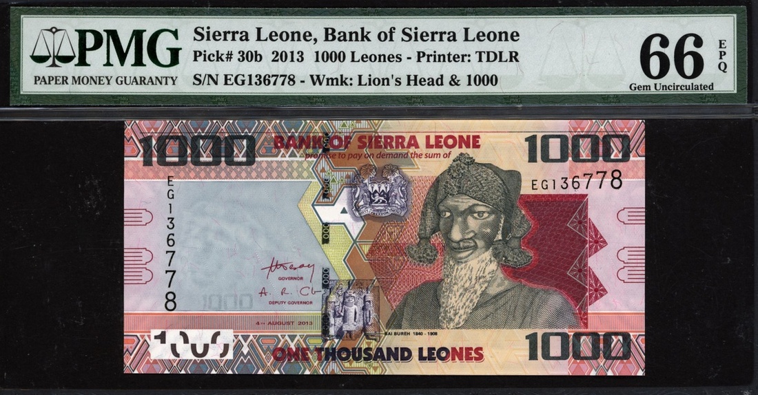 (x) Bank of Sierra Leone, 1000 leones, 2013, serial number EG136778, (Pick 30b), in PMG holder 66 EPQ Gem Uncirculated