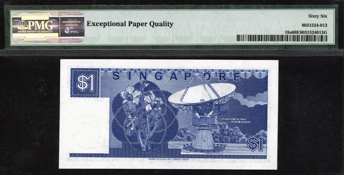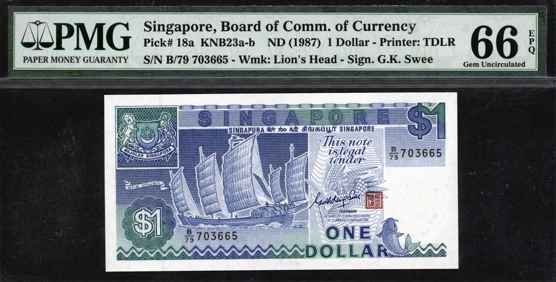 (x) Board of Comm. of Currency, Singapore, 1 dollar, ND (1987), serial number B/79 703665, (Pick 18a), in PMG holder 66 EPQ Gem Uncirculated