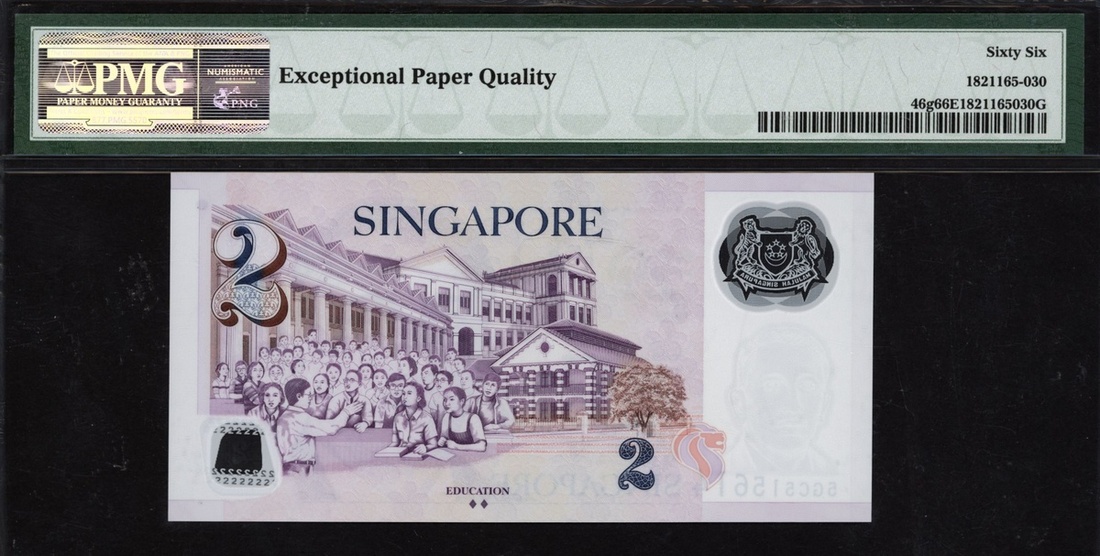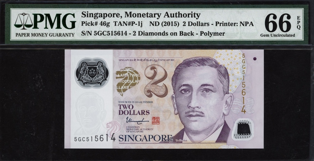 (x) Monetary Authority, Singapore, 2 dollars, ND (2015), serial number 5GC515614, (Pick 46g), in PMG holder 66 EPQ Gem Uncirculated