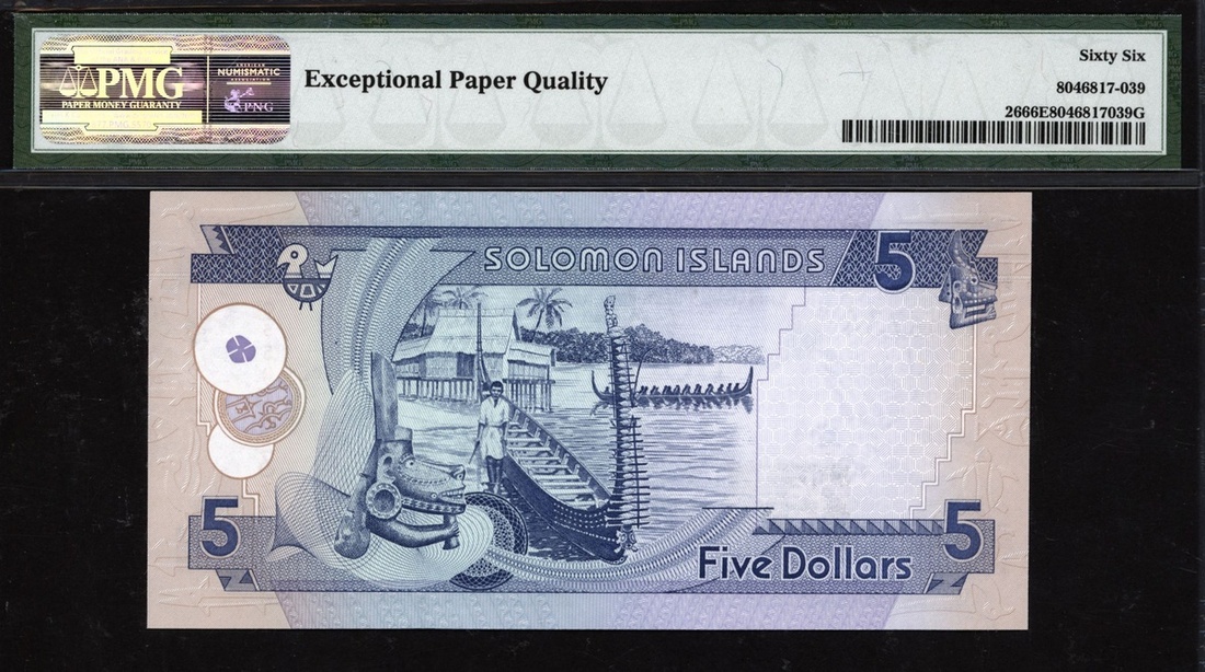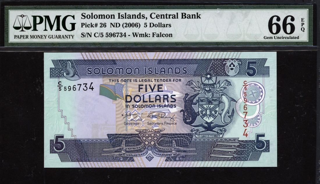 (x) Central Bank, Solomon Islands, 5 dollars, ND (2006), serial number C/5 596734, (Pick 26), in PMG holder 66 EPQ Gem Uncirculated