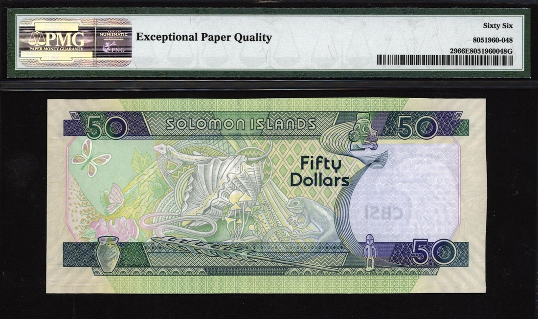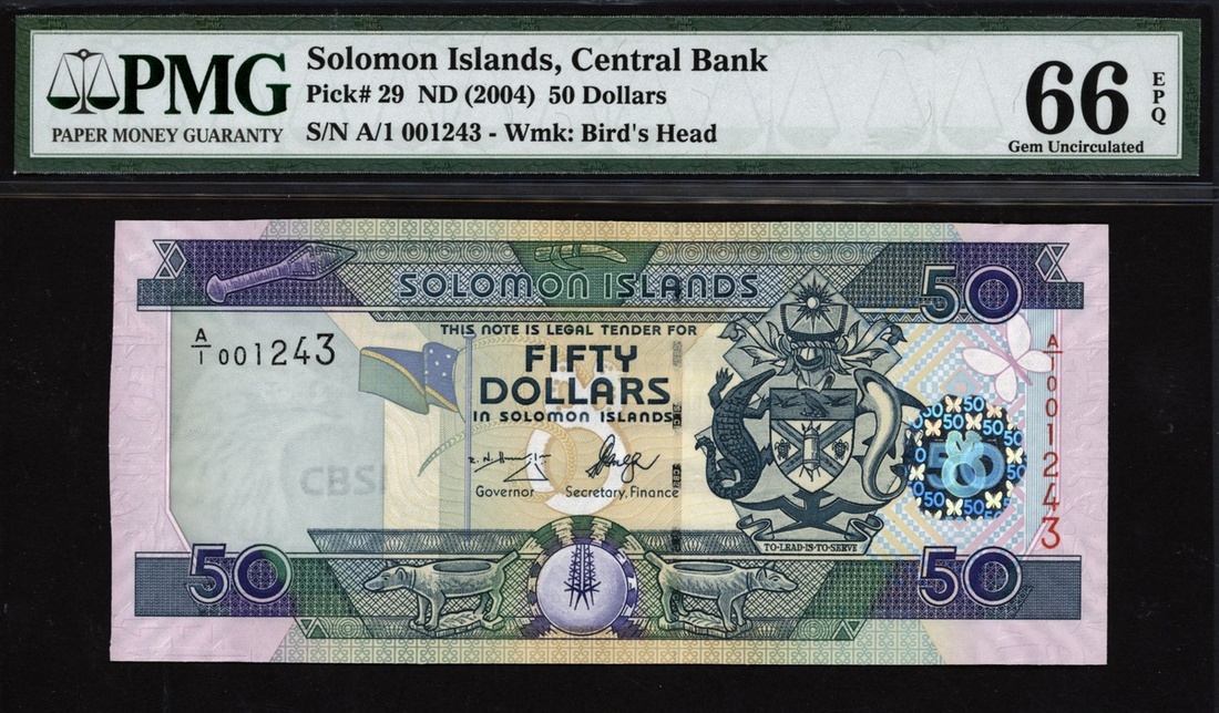 (x) Central Bank, Solomon Islands, 50 dollars, ND (2004), serial number A/1 001243, (Pick 29), in PMG holder 66 EPQ Gem Uncirculated