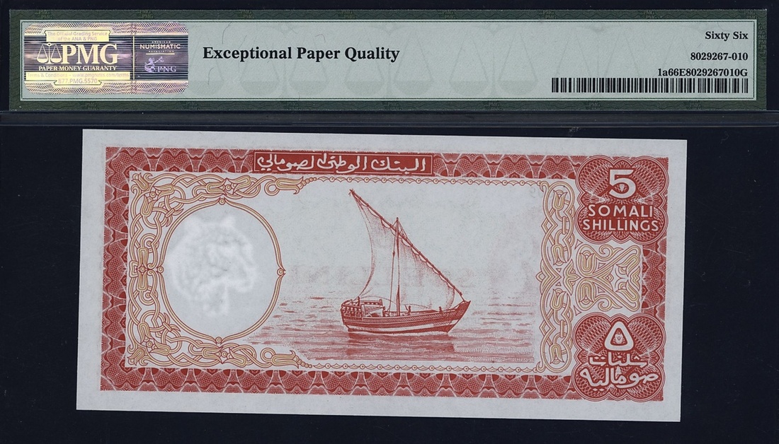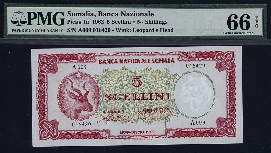 (x) Banca Nazionale Somalia, 5 scellini = 5/- shillings, 1962, serial number A009 016420, (Pick 1a), in PMG holder 66 EPQ Gem Uncirculated