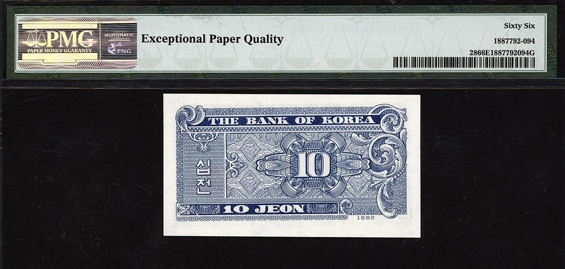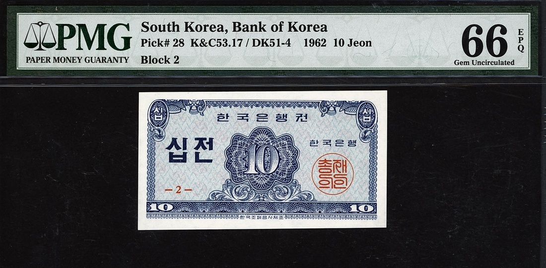 (x) Bank of Korea, South Korea, 10 jeon, 1962, block 2, (Pick 28), in PMG holder 66 EPQ Gem Uncirculated