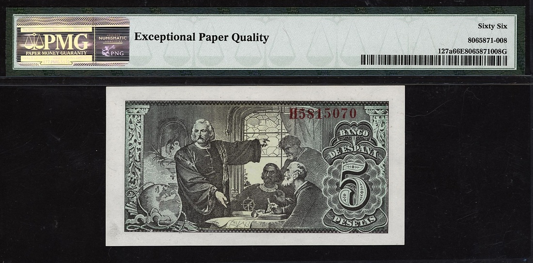 (x) Banco de Espana, Spain, 5 pesetas, 1943, serial number H5815070, (Pick 127a), in PMG holder 66 EPQ Gem Uncirculated
