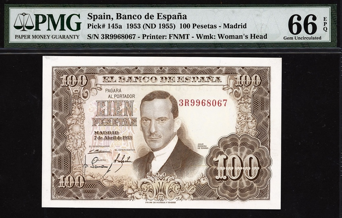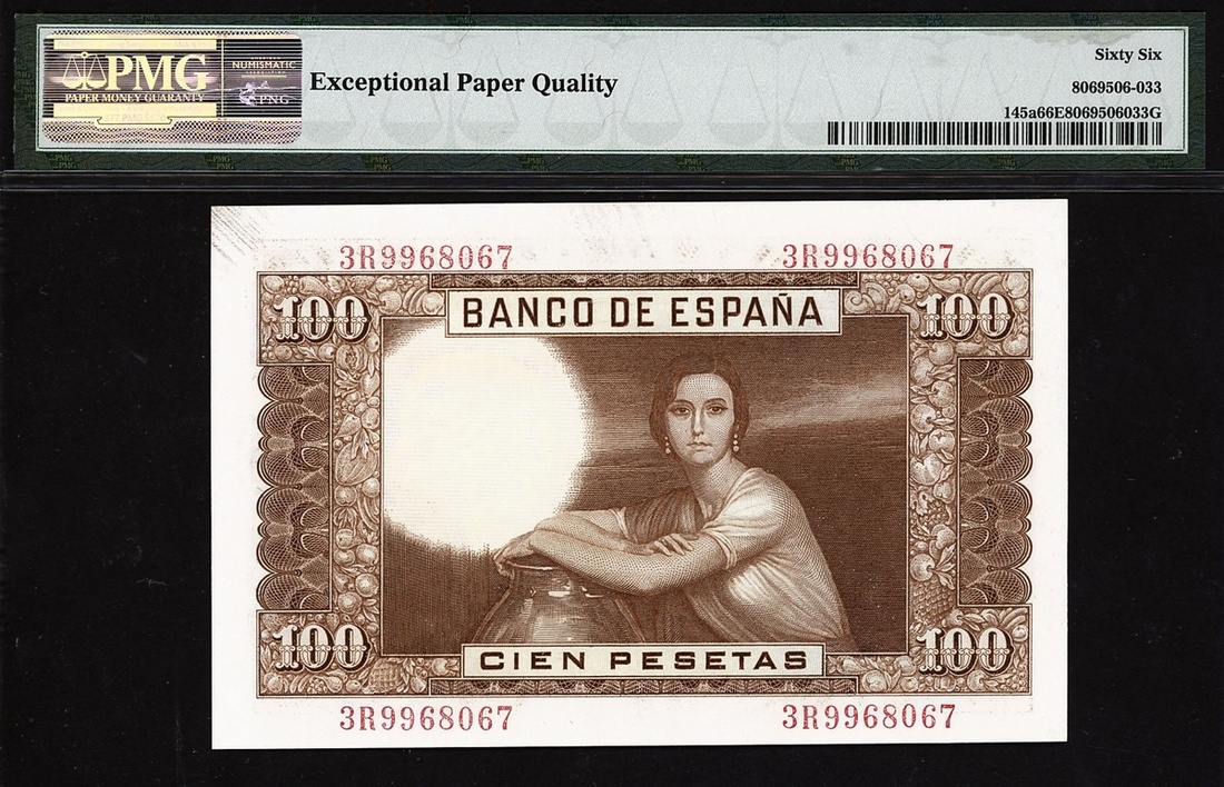 (x) Banco de Espana, Spain, 100 pesetas, 1953 (ND 1955), serial number 3R9968067, (Pick 145a), in PMG holder 66 EPQ Gem Uncirculated