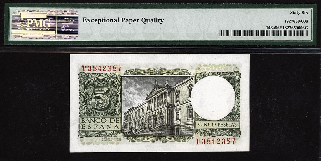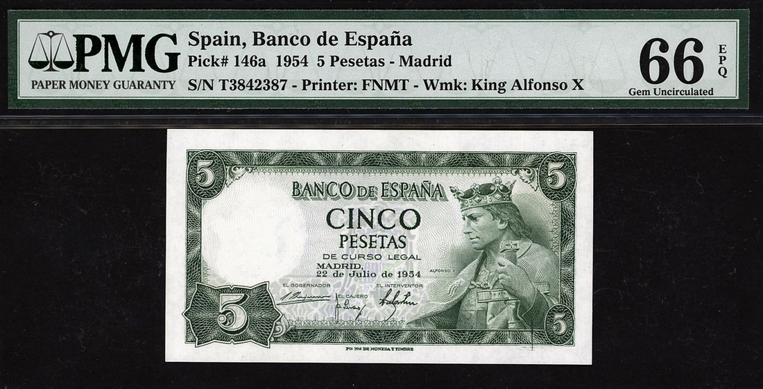 (x) Banco de Espana, Spain, 5 pesetas, 1954, serial number T3842387, (Pick 146a), in PMG holder 66 EPQ Gem Uncirculated