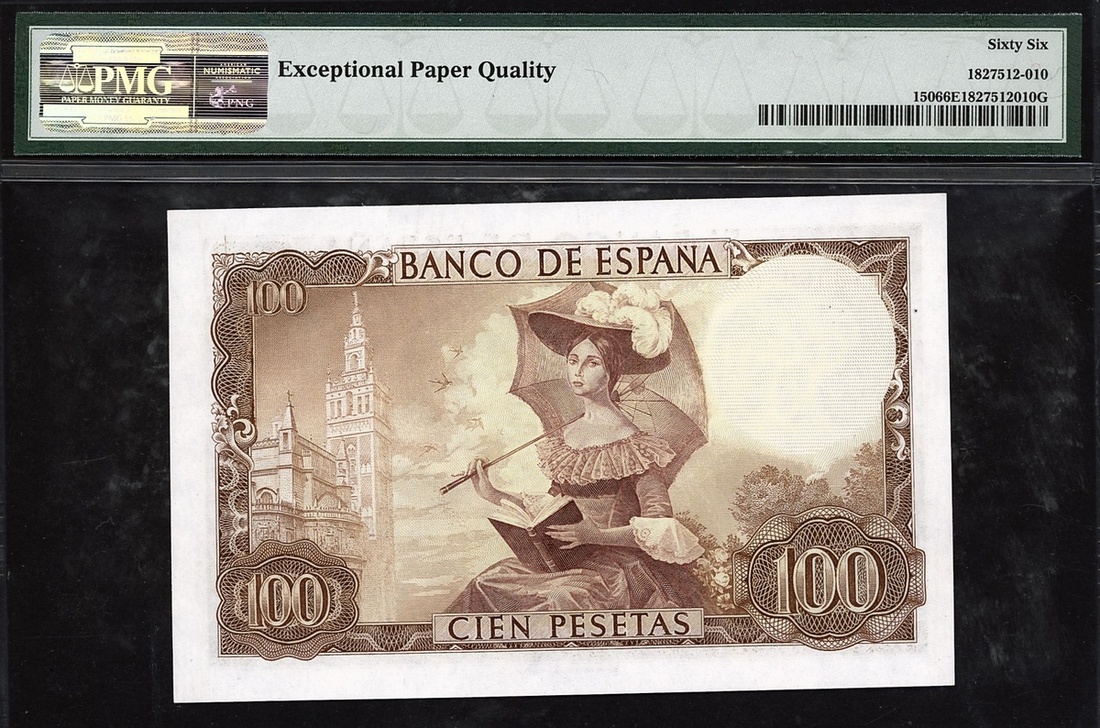 (x) Banco de Espana, Spain, 100 pesetas, 1965, (ND 1970), serial number 1S3969561, (Pick 150), in PMG holder 66 EPQ Gem Uncirculated