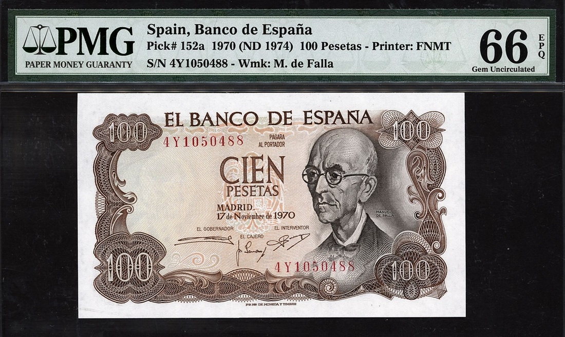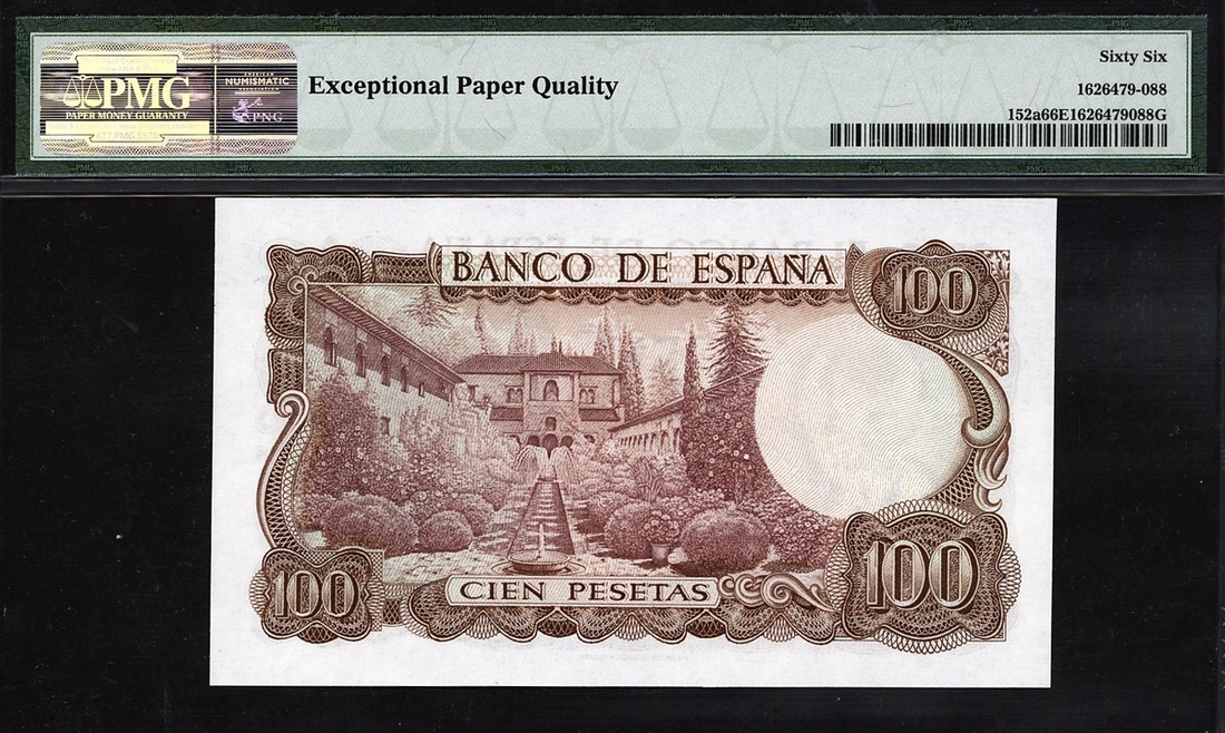 (x) Banco de Espana, Spain, 100 pesetas, 1970 (ND 1974), serial number 4Y1050488, (Pick 152a), in PMG holder 66 EPQ Gem Uncirculated