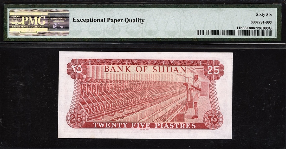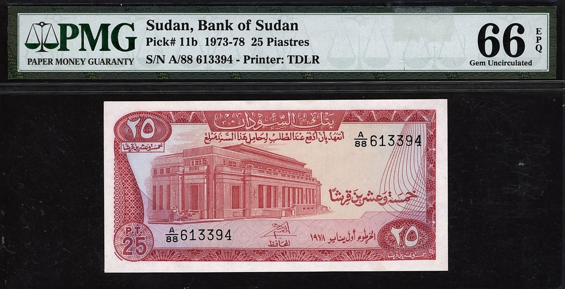 (x) Bank of Sudan, 25 piastres, 1973-78, serial number A/88 613394, (Pick 11b), in PMG holder 66 EPQ Gem Uncirculated