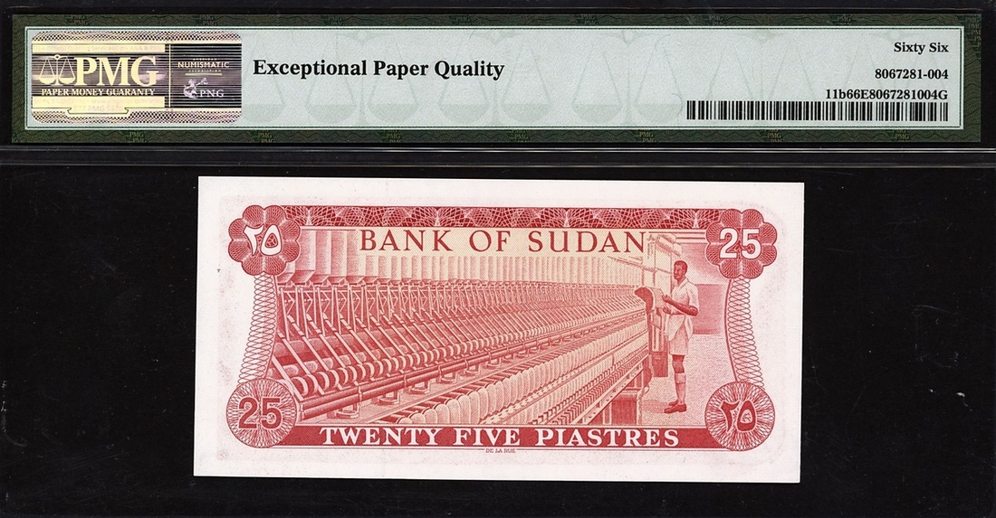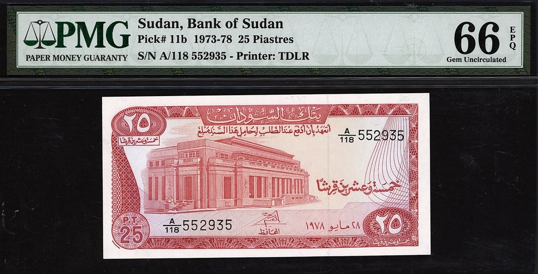 (x) Bank of Sudan, 25 piastres, 1973-78, serial number A/118 552935, (Pick 11b), in PMG holder 66 EPQ Gem Uncirculated