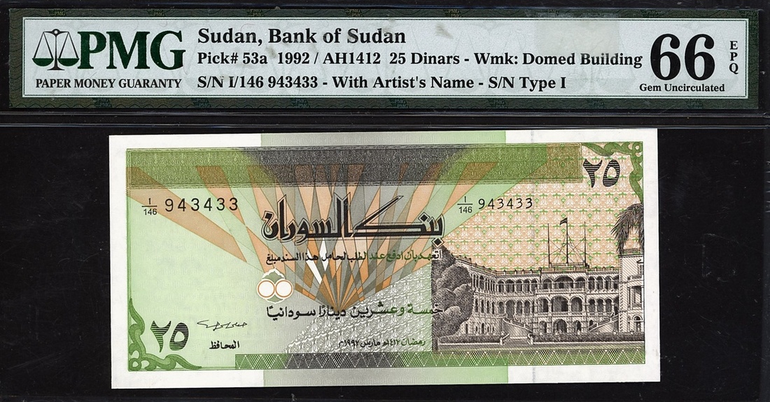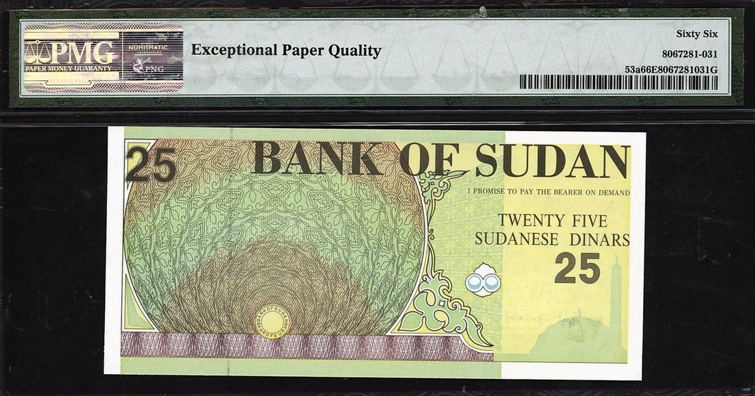 (x) Bank of Sudan, 25 dinars, 1992, serial number I/146 943433, (Pick 53a), in PMG holder 66 EPQ Gem Uncirculated