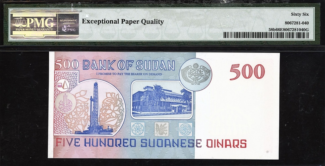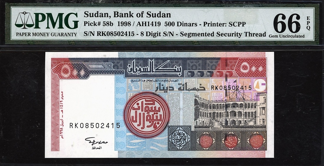 (x) Bank of Sudan, 500 dinars, 1998, serial number RK08502415, (Pick 58b), in PMG holder 66 EPQ Gem Uncirculated