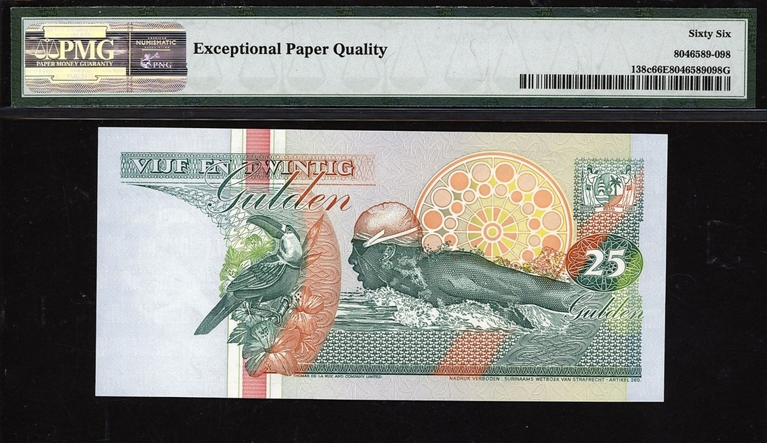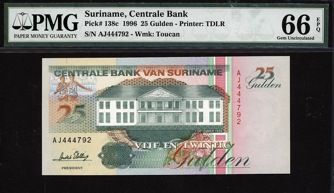(x) Centrale Bank van Suriname, 25 gulden, 1996, serial number AJ444792, (Pick 138c), in PMG holder 66 EPQ Gem Uncirculated