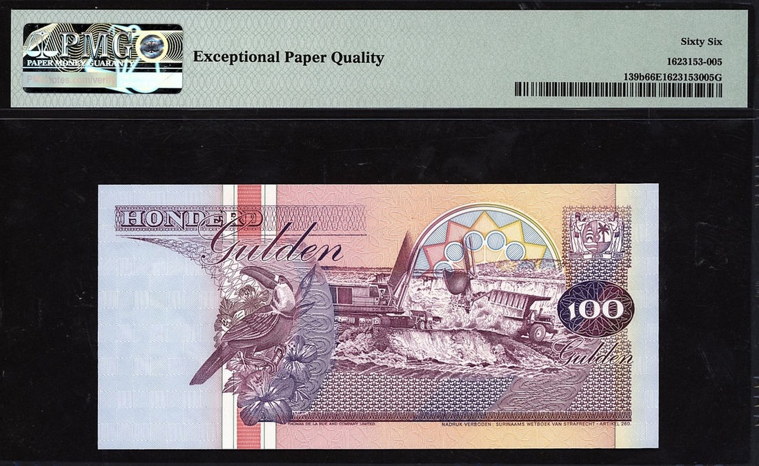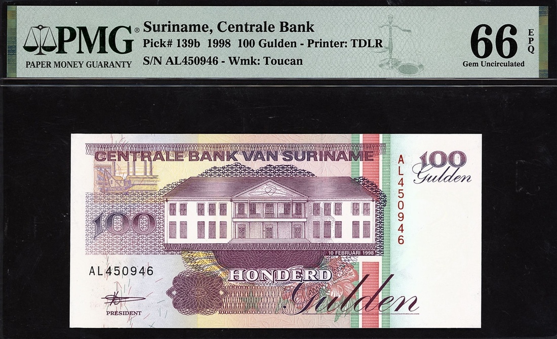 (x) Centrale Bank van Suriname, 100 gulden, 1998, serial number AL450946, (Pick 139b), in PMG holder 66 EPQ Gem Uncirculated