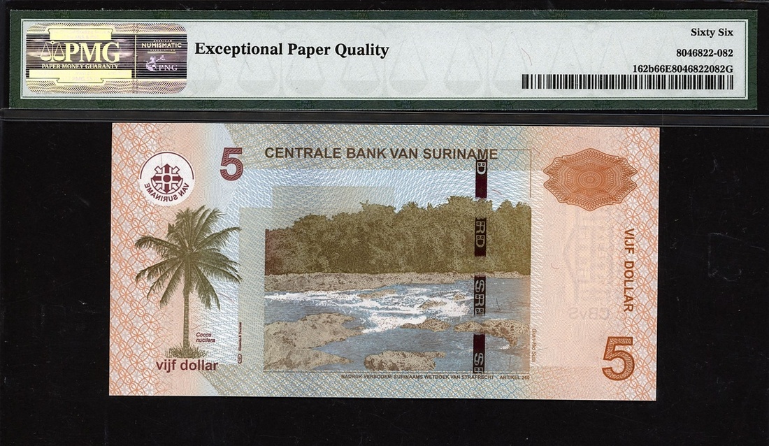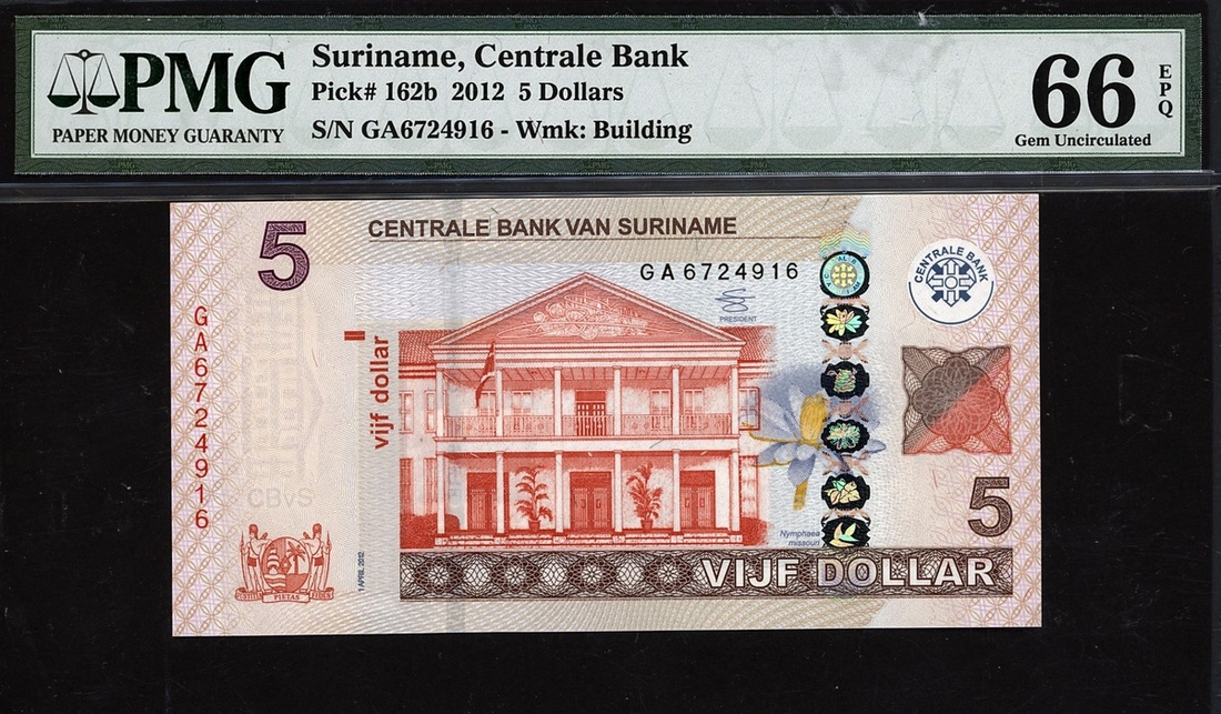 (x) Centrale Bank van Suriname, 5 dollars, 2012, serial number GA6724916, (Pick 162b), in PMG holder 66 EPQ Gem Uncirculated