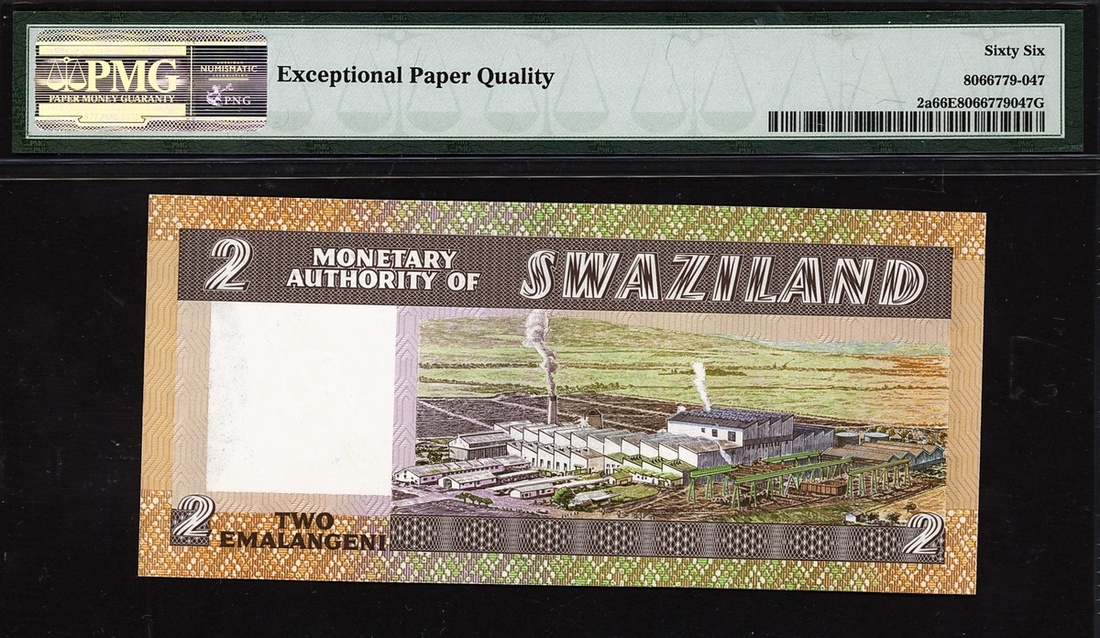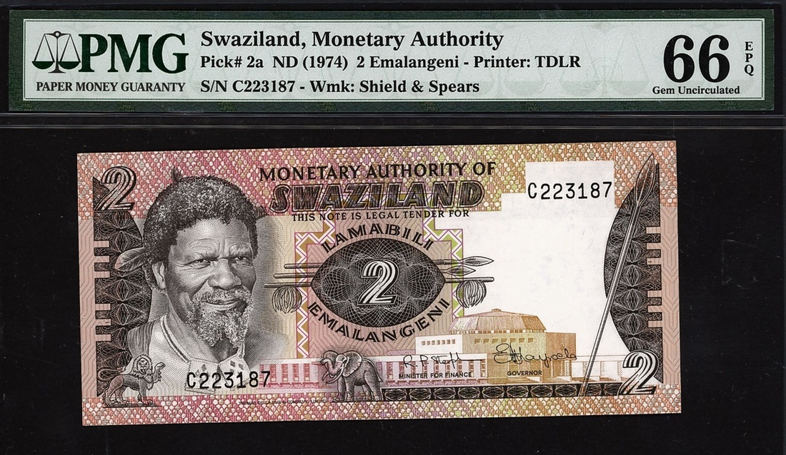 (x) Monetary Authority of Swaziland, 2 emalangeni, ND (1974), serial number C223187, (Pick 2a), in PMG holder 66 EPQ Gem Uncirculated