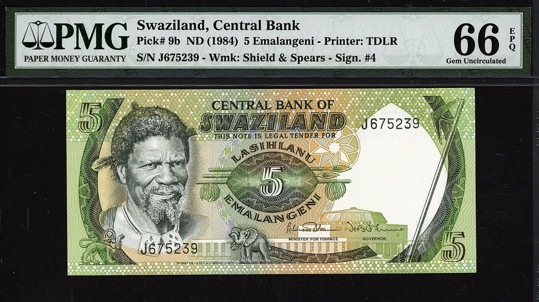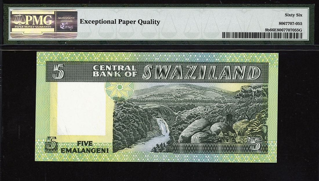 (x) Central Bank of Swaziland, 5 emalangeni, ND (1984), serial number J675239, (Pick 9b), in PMG holder 66 EPQ Gem Uncirculated