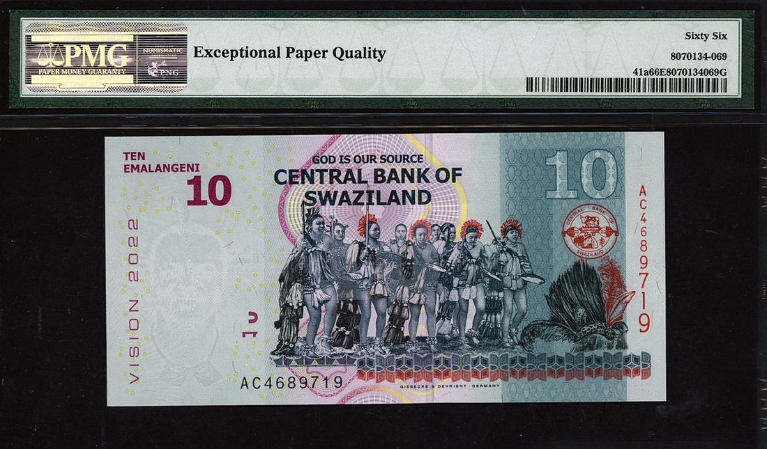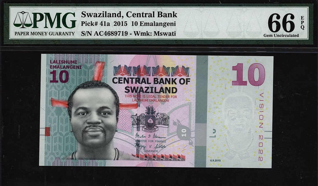 (x) Central Bank of Swaziland, 10 emalangeni, 2015, serial number AC4689719, (Pick 41a), in PMG holder 66 EPQ Gem Uncirculated