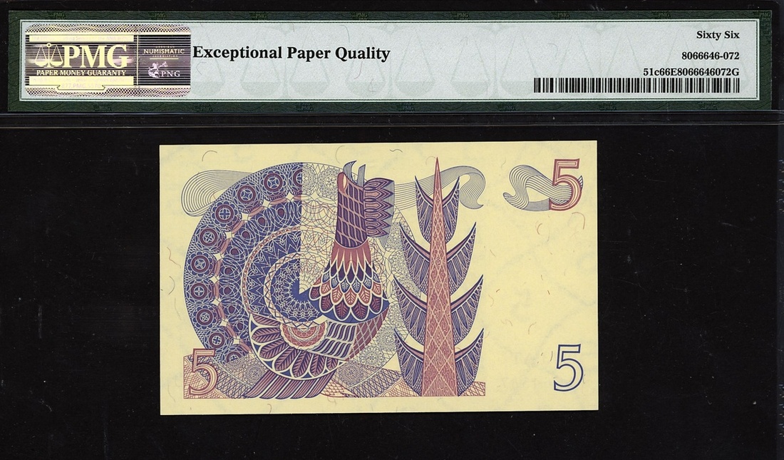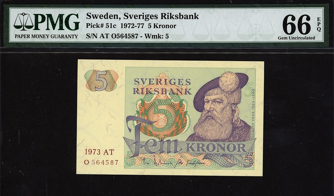 (x) Sveriges Riksbank, Sweden, 5 kronor, 1972-77, serial number AT O564587, (Pick 51c), in PMG holder 66 EPQ Gem Uncirculated
