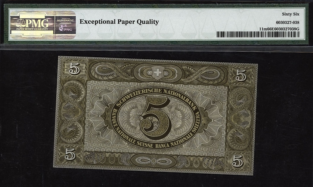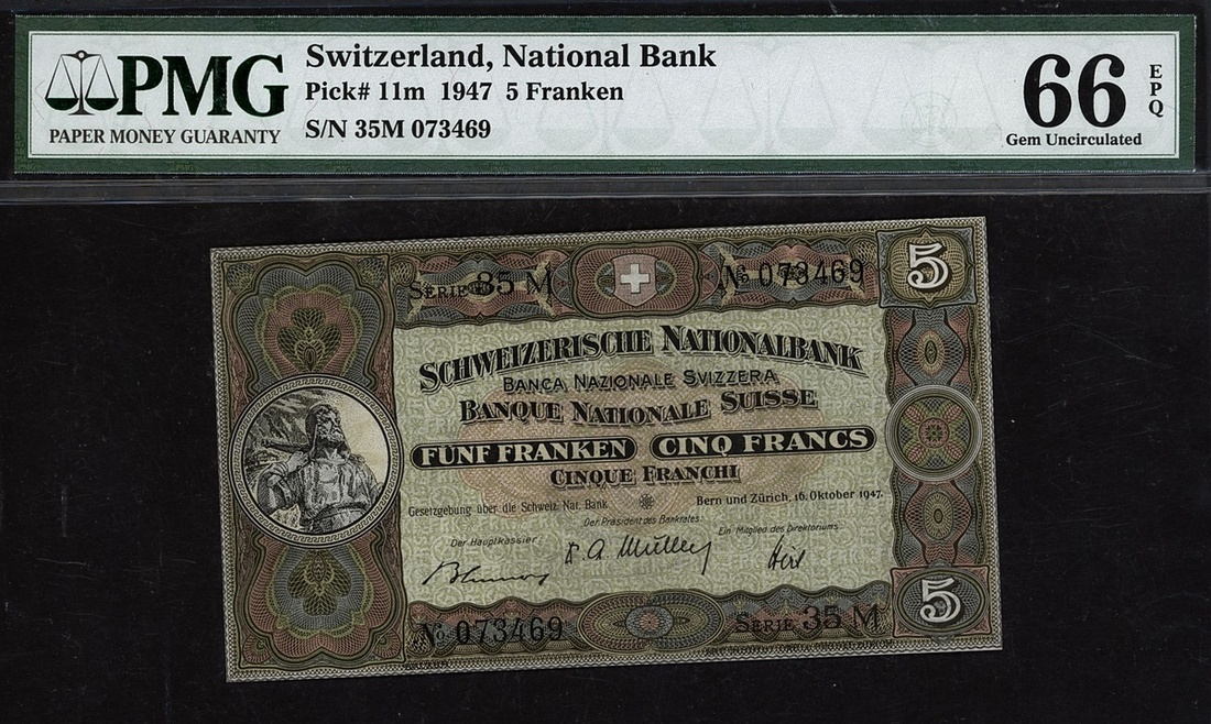 (x) National Bank, Switzerland, 5 franken, 1947, serial number 35M 073469, (Pick 11m), in PMG holder 66 EPQ Gem Uncirculated