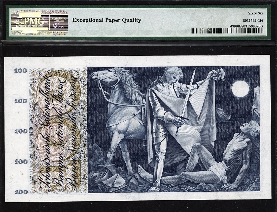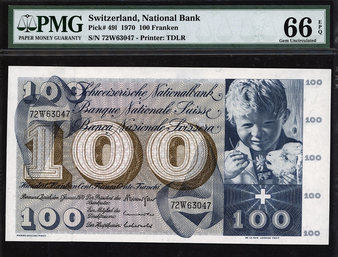 (x) National Bank, Switzerland, 100 franken, 1970, serial number 72W63047, (Pick 49l), in PMG holder 66 EPQ Gem Uncirculated