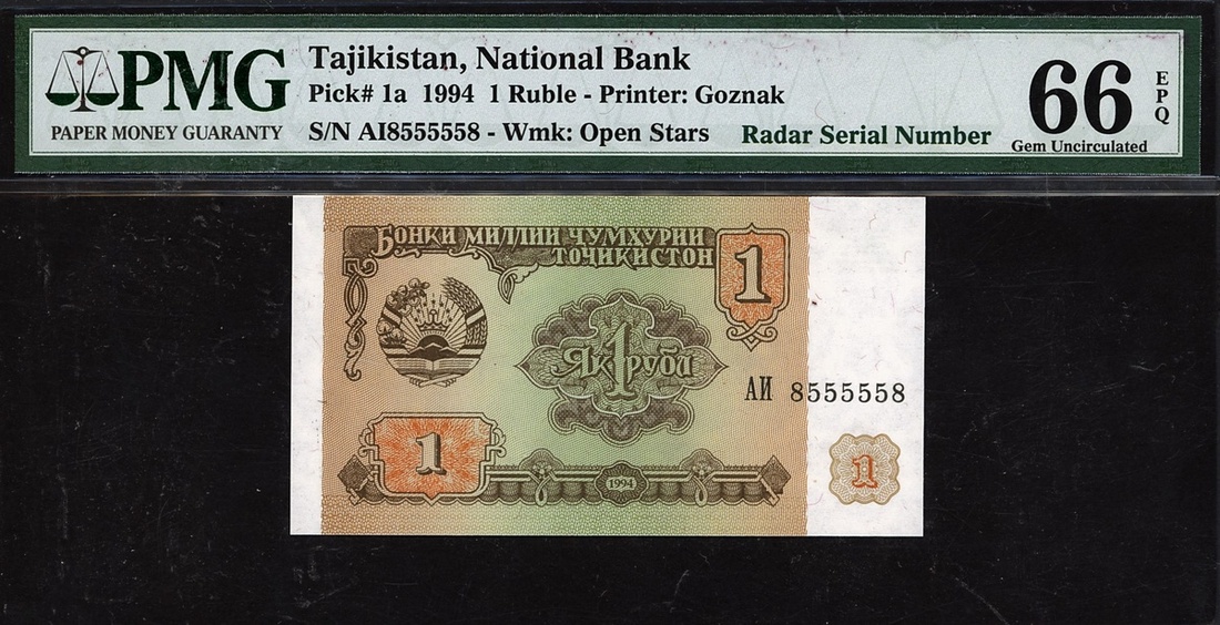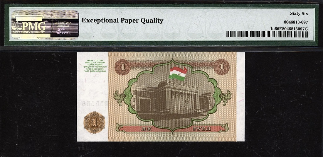 (x) National Bank, Tajikistan, 1 ruble, 1994, serial number AI8555558, (Pick 1a), in PMG holder 66 EPQ Gem Uncirculated