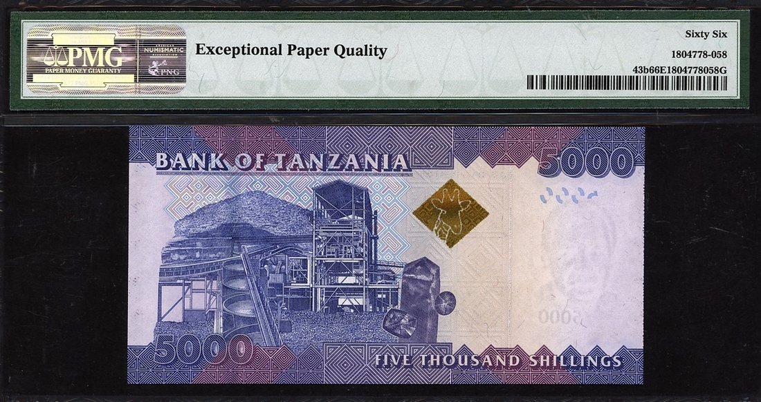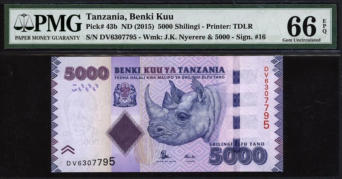 (x) Benki Kuu ya Tanzania, 5000 shilingi, ND (2015), serial number DV6307795, (Pick 43b), in PMG holder 66 EPQ Gem Uncirculated