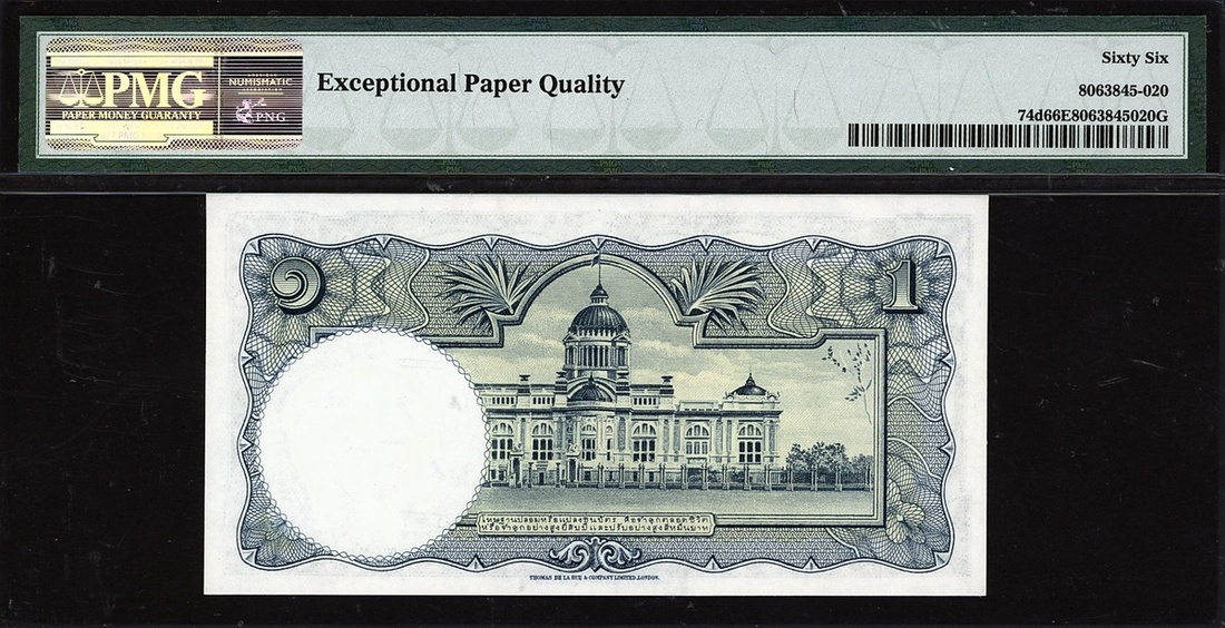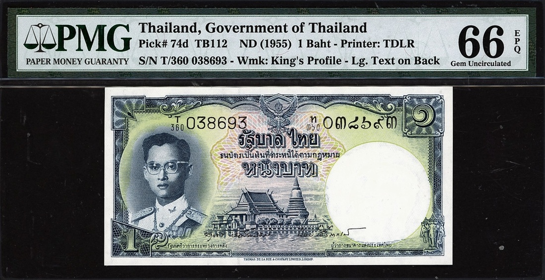 (x) Government of Thailand, 1 baht, ND (1955), serial number T/360 038693, (Pick 74d), in PMG holder 66 EPQ Gem Uncirculated