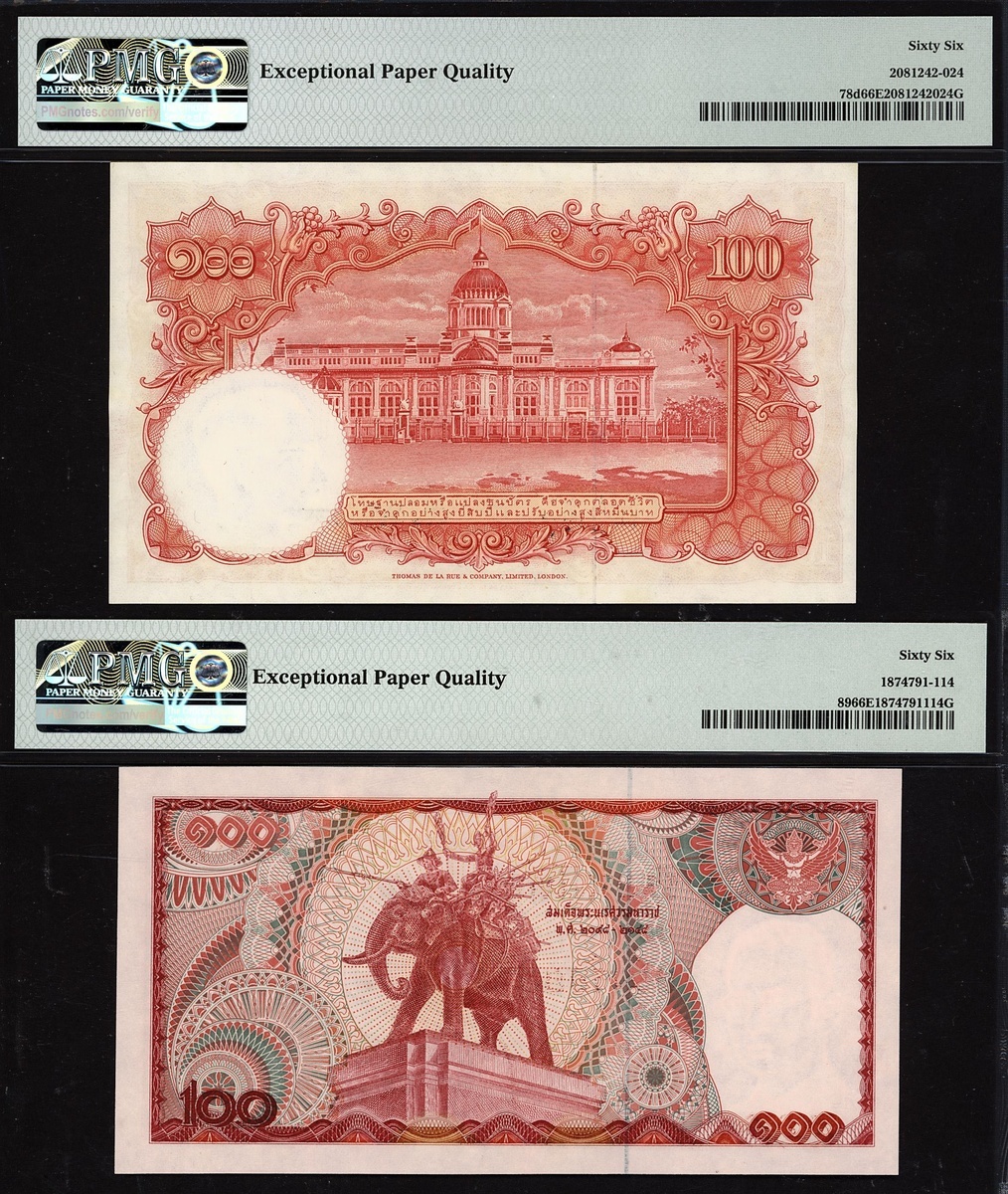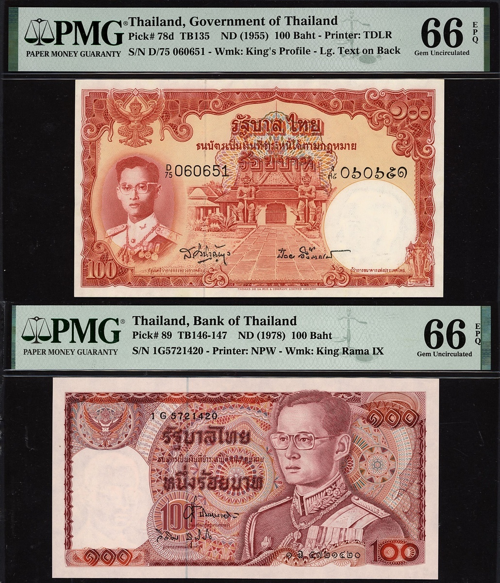 (x) Government of Thailand, 100 baht, ND (1955), serial number D/75 060651, also a 100 baht, ND (1978), serial number 1G5721420,