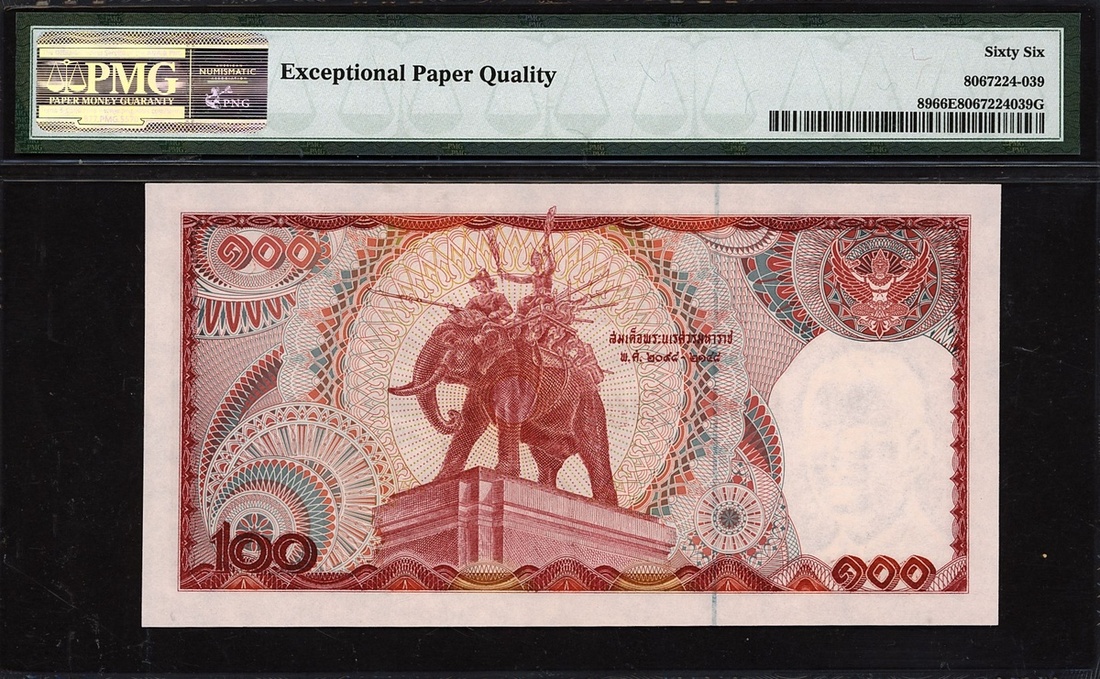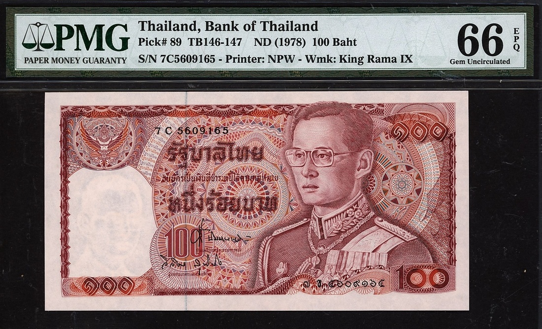 (x) Bank of Thailand, 100 baht, ND (1978), serial number 7C5609165, (Pick 89), in PMG holder 66 EPQ Gem Uncirculated