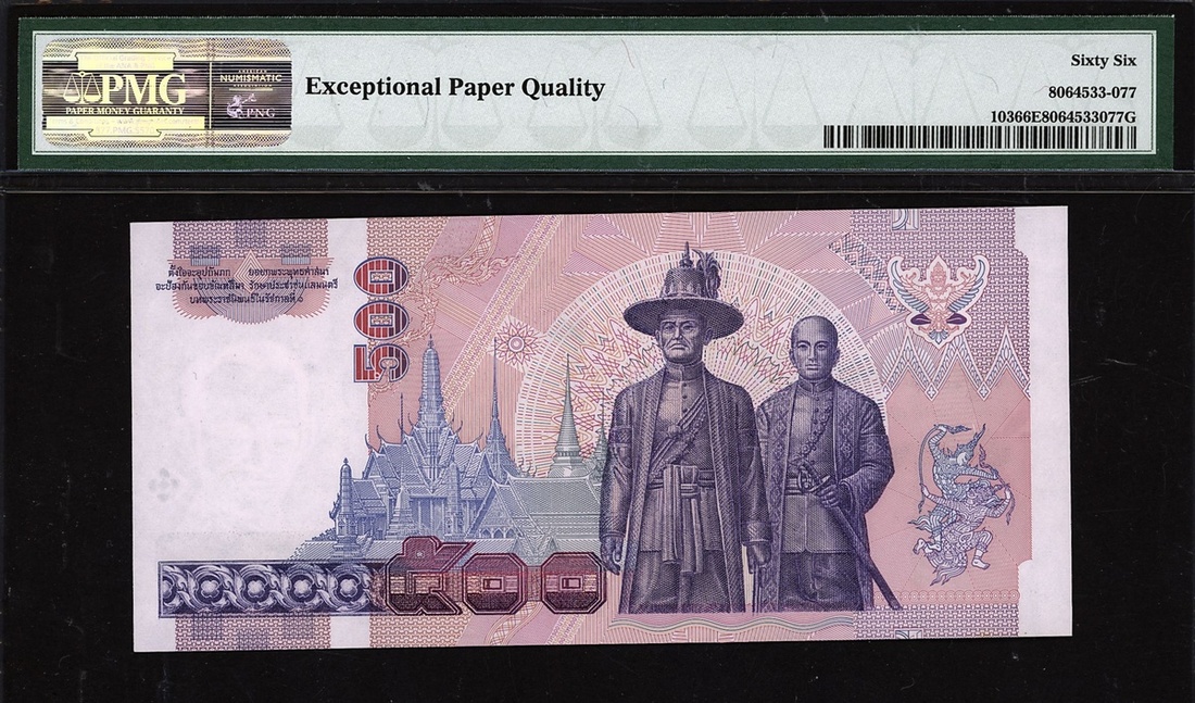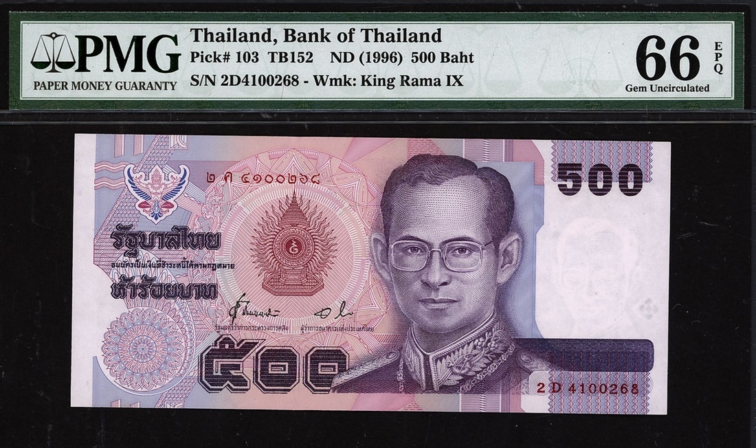 (x) Bank of Thailand, 500 baht, ND (1996), serial number 2D4100268, (Pick 103), in PMG holder 66 EPQ Gem Uncirculated