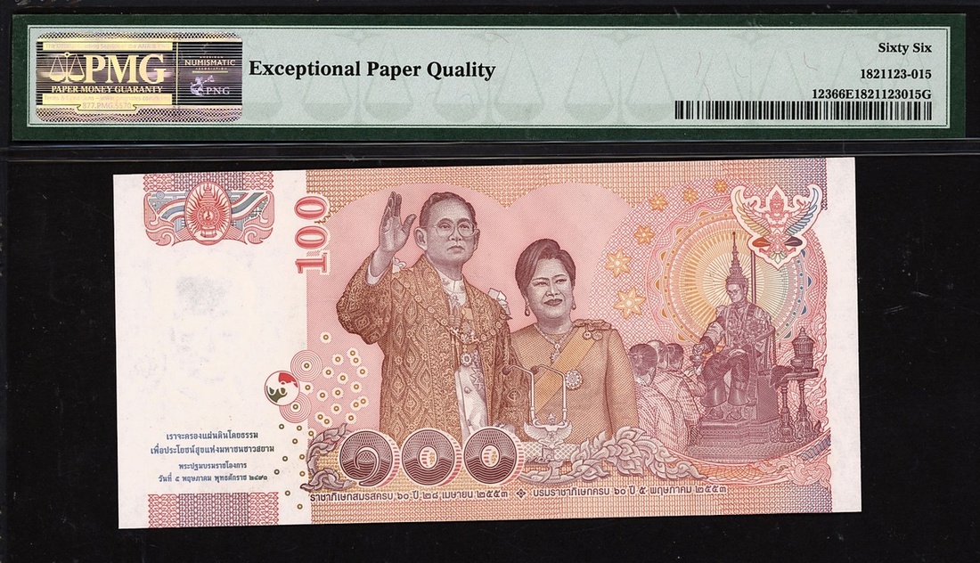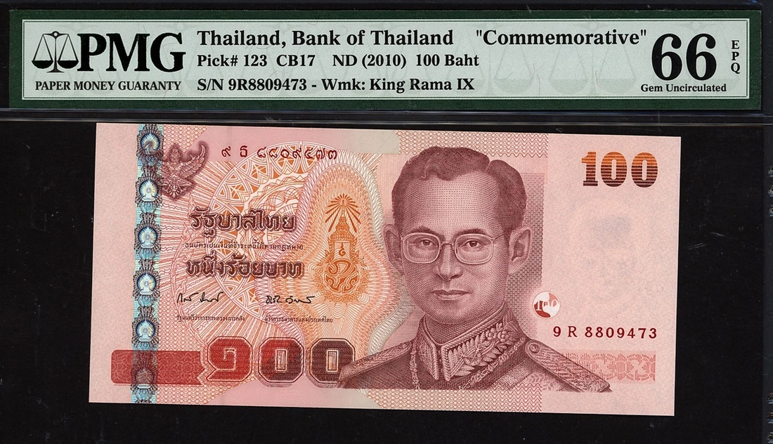 (x) Bank of Thailand, 100 baht, ND (2010), serial number 9R8809473, (Pick 123), in PMG holder 66 EPQ Gem Uncirculated