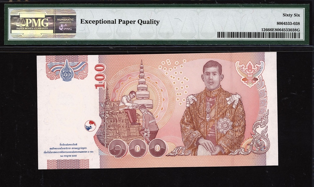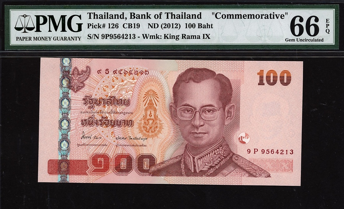 (x) Bank of Thailand, 100 baht, ND (2012), serial number 9P9564213, (Pick 126), in PMG holder 66 EPQ Gem Uncirculated