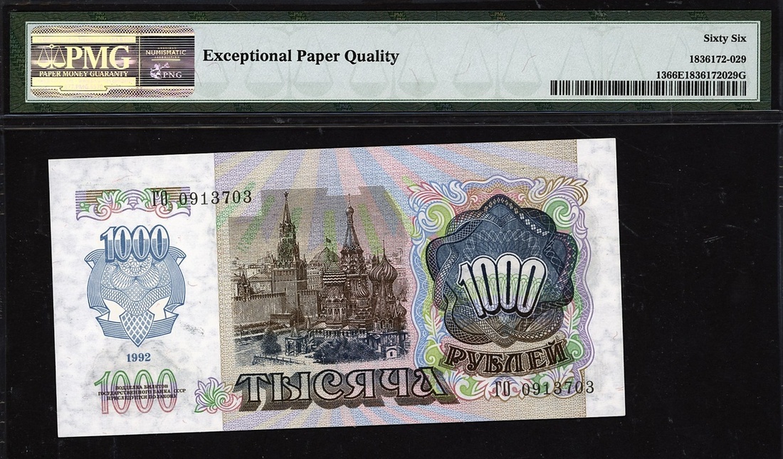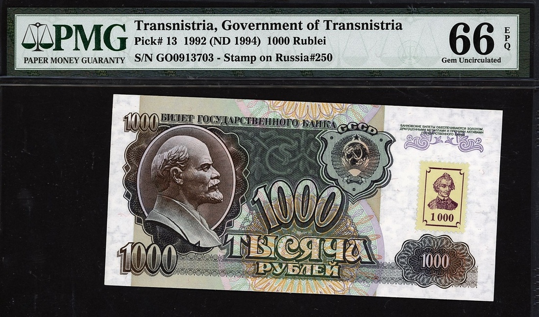 (x) Government of Transnistria, 1000 rublei, 1992 (ND 1994), serial number GO0913703, (Pick 13), in PMG holder 66 EPQ Gem Uncirculated