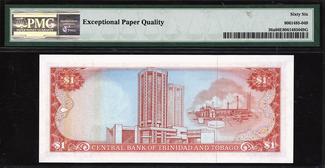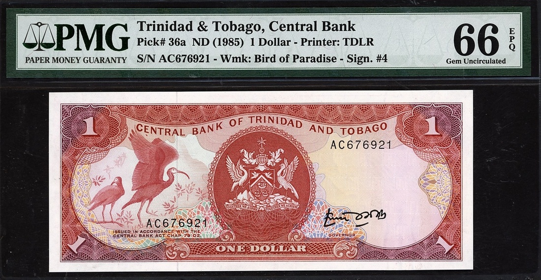 (x) Central Bank of Trinidad & Tobago, 1 dollar, 1985, serial number AC676921, (Pick 36a), in PMG holder 66 EPQ Gem Uncirculated