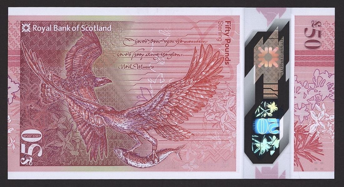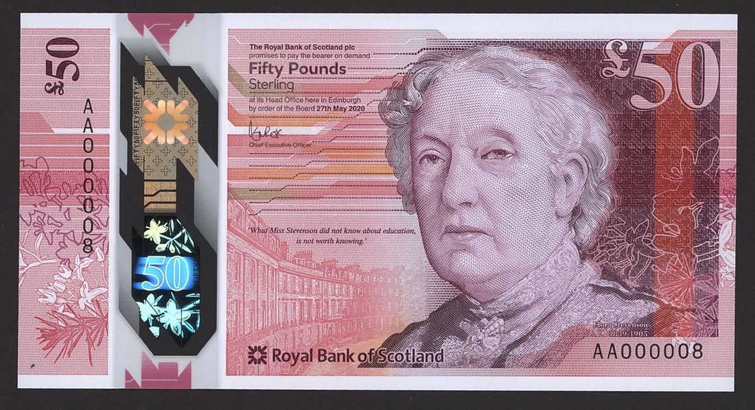 Royal Bank of Scotland plc, polymer £50, 27 May 2020, serial number AA000008, red and pink, the Scottish education campaigner and pioneer Flora Stevenson at right, Randolph Crescent in Edinburgh where Flora Stevenson lived at centre left, reverse pair of ospreys