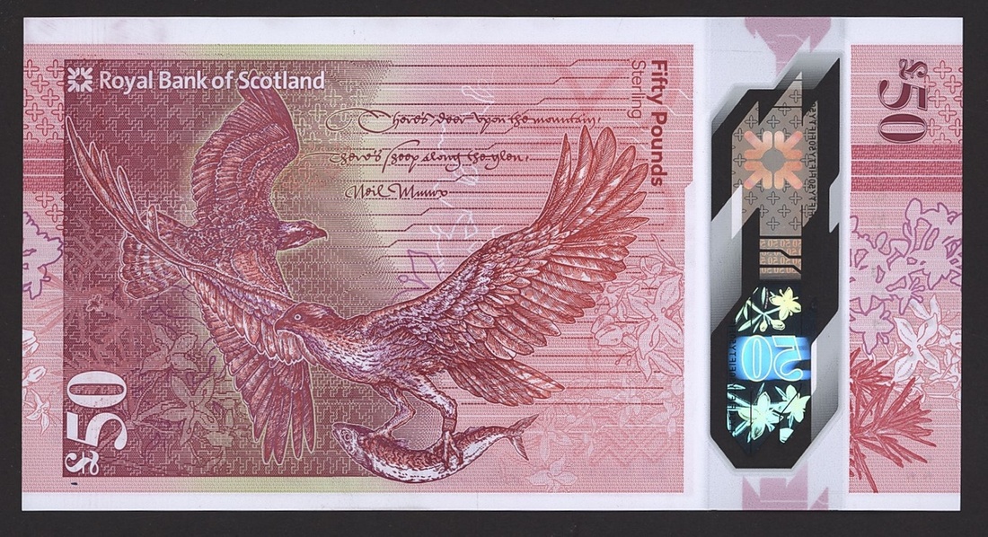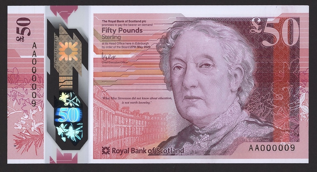 Royal Bank of Scotland plc, polymer £50, 27 May 2020, serial number AA000009, red and pink, the Scottish education campaigner and pioneer Flora Stevenson at right, Randolph Crescent in Edinburgh where Flora Stevenson lived at centre left, reverse pair of ospreys