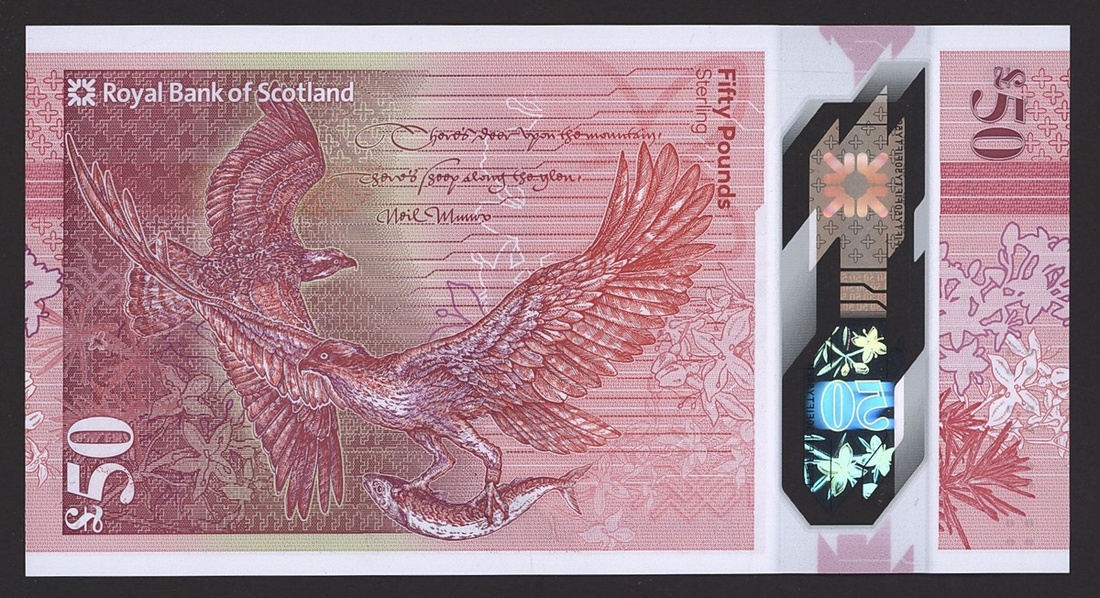 Royal Bank of Scotland plc, polymer £50, 27 May 2020, serial number AA000011, red and pink, the Scottish education campaigner and pioneer Flora Stevenson at right, Randolph Crescent in Edinburgh where Flora Stevenson lived at centre left, reverse pair of ospreys