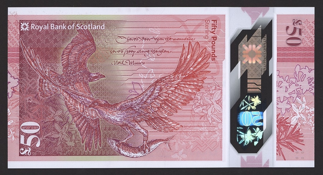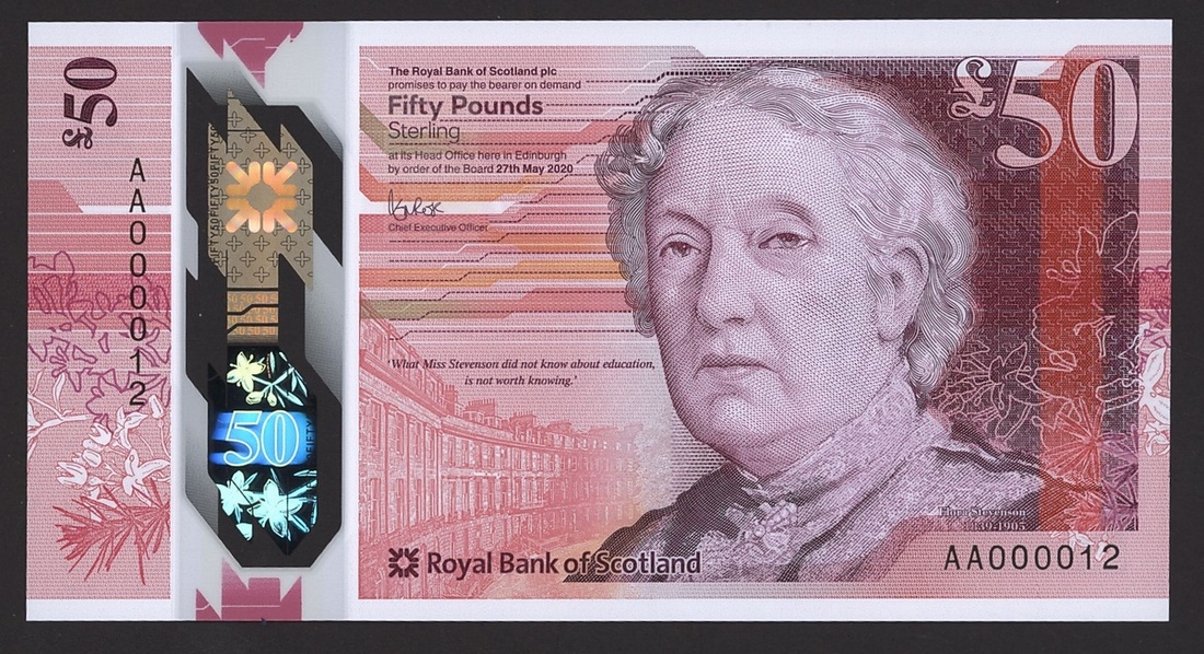 Royal Bank of Scotland plc, polymer £50, 27 May 2020, serial number AA000012, red and pink, the Scottish education campaigner and pioneer Flora Stevenson at right, Randolph Crescent in Edinburgh where Flora Stevenson lived at centre left, reverse pair of ospreys